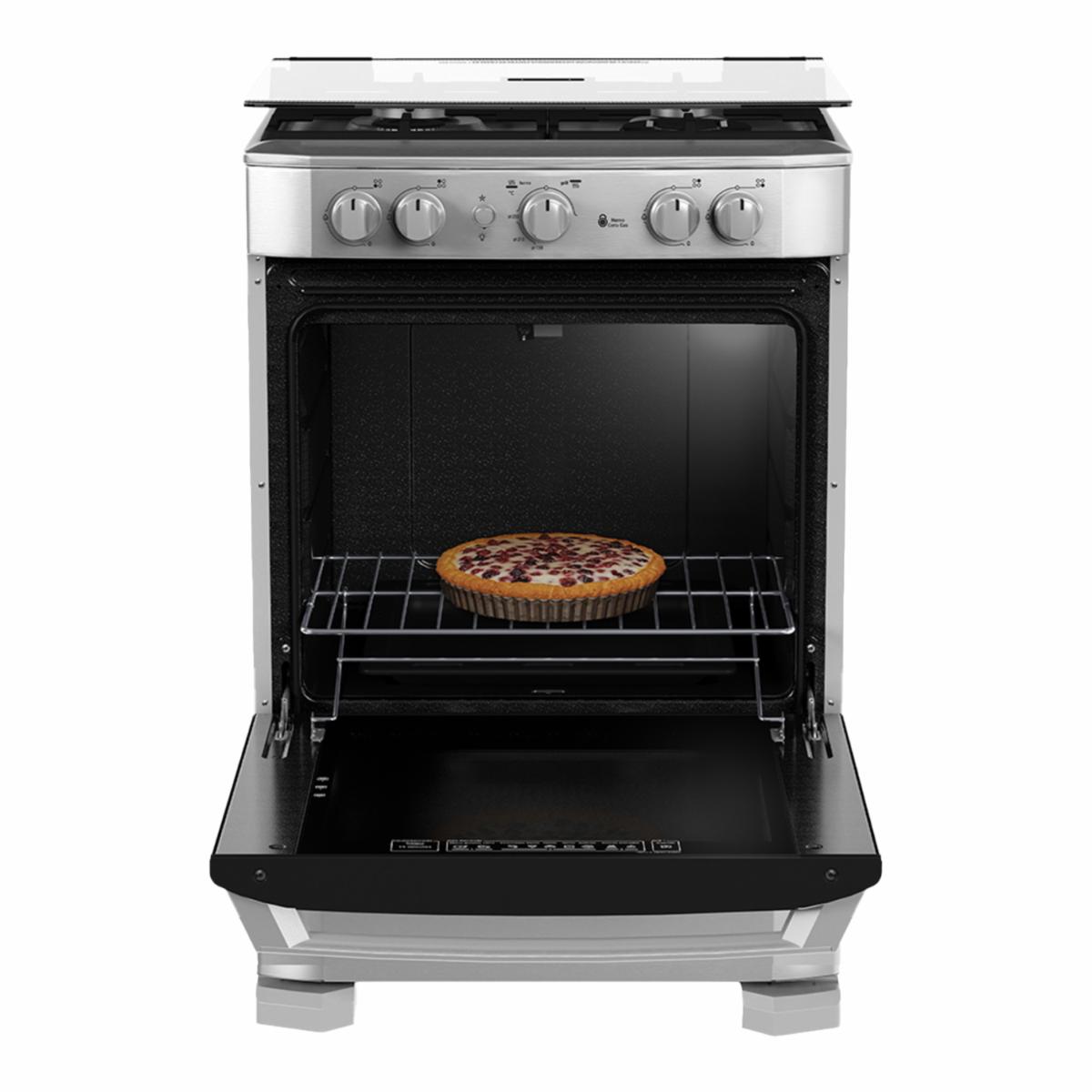 - Cocina con estilo y seguridad gracias a esta estufa a gas con horno, diseñada para facilitar tus preparaciones diarias. Su cubierta de acero inoxidable sellada evita derrames, mientras que las parrillas de hierro fundido ofrecen máxima estabilidad al cocinar. El horno cuenta con válvula de seguridad, luz interior y sistema Easy Clean Pro para una limpieza sin esfuerzo