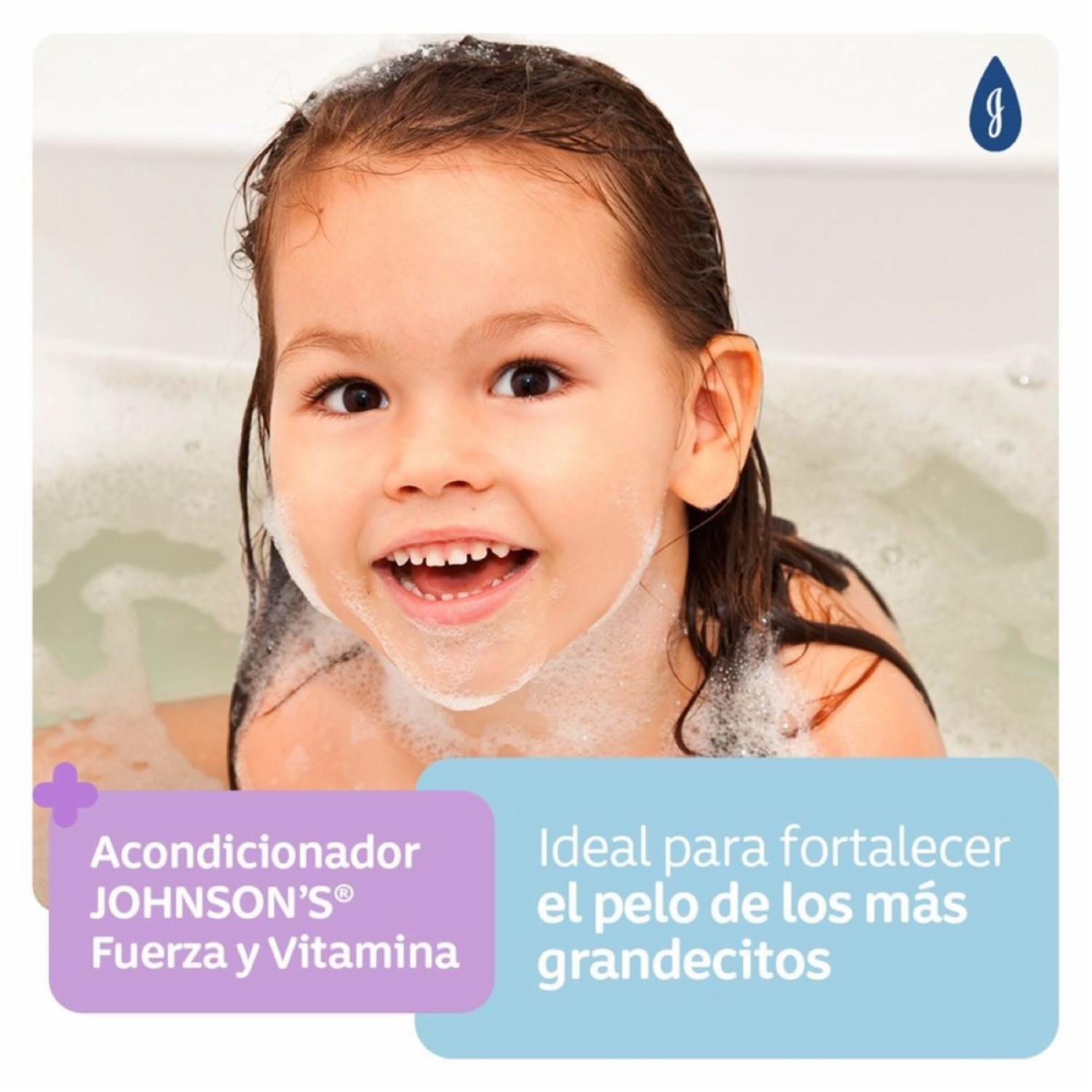 Acondicionador JOHNSON'S Fuerza Vitamina realza la fuerza natural propia del pelo en desarrollo, con triple protección contra el quiebre