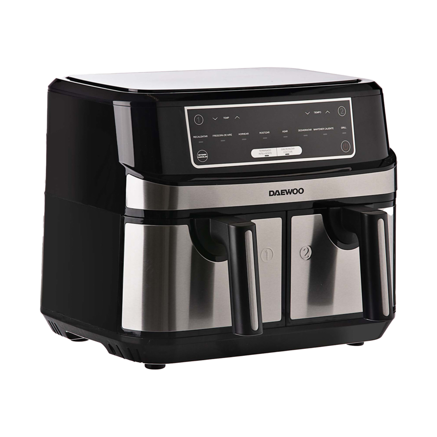- freidora de aire de doble zona. cocina dos plastos a la vez. smart - finalizar programas - permite cocinar 2 platos para terminar de cocinar al mismo tiempo.
