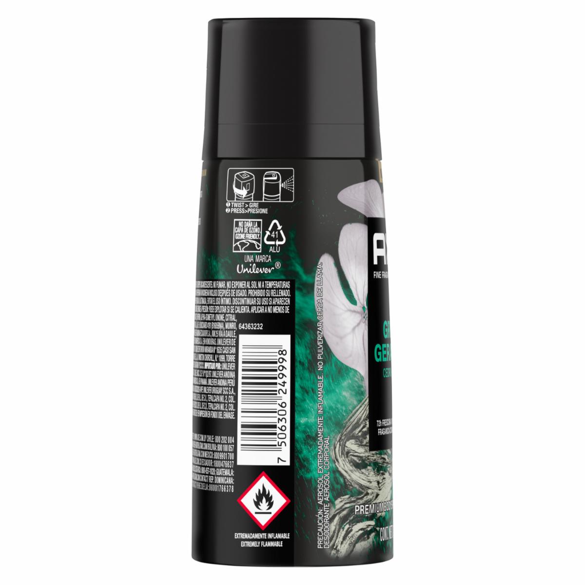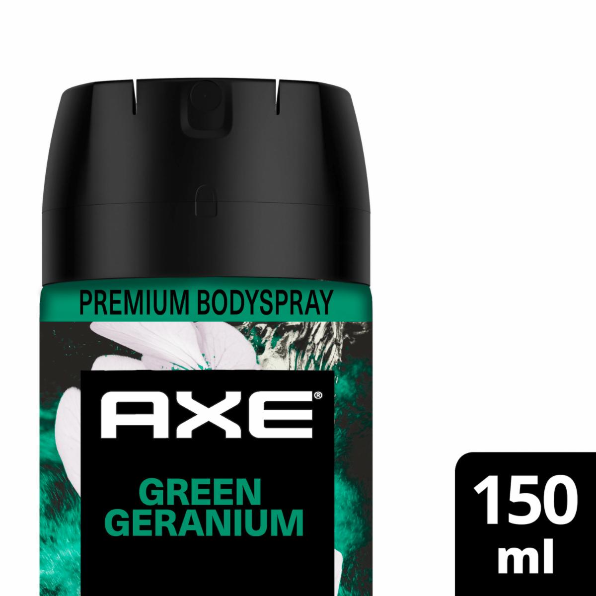 - Body Spray Green Geranium AXE Cedro+Pachulí. Disfruta de una frescura natural con el aroma revitalizante del geranio verde. Protege eficazmente contra el mal olor y te mantiene fresco todo el día