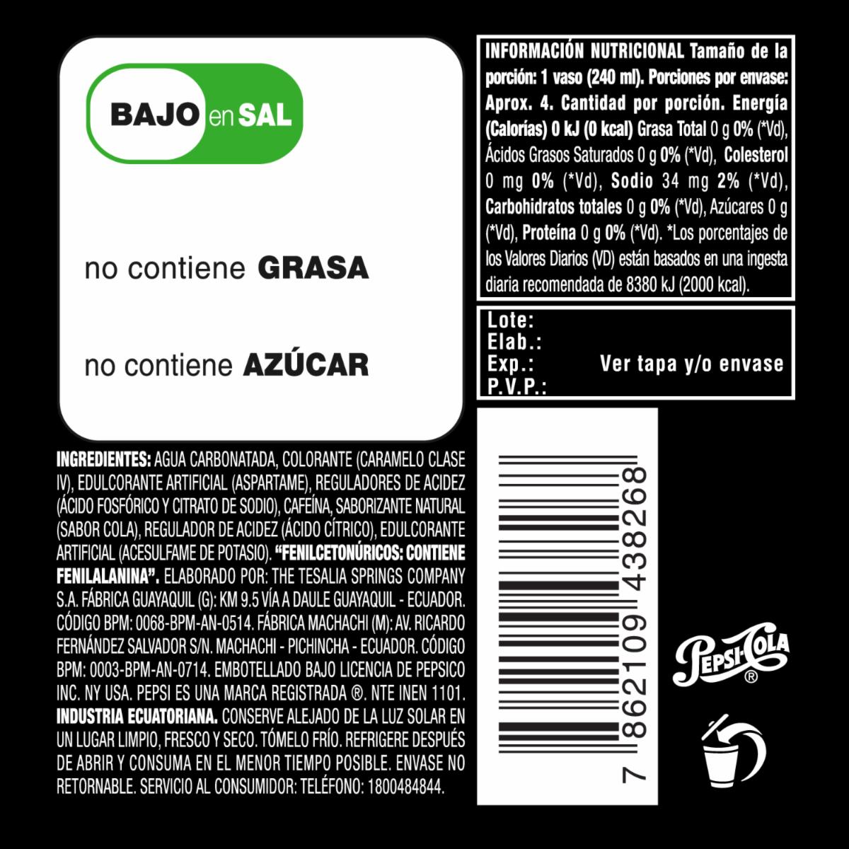 Bebida Gaseosa Sin Azúcar PEPSI 1000 Ml – PEPSI. Disponible en nuestros locales. Precio y stock pueden variar según la tienda.