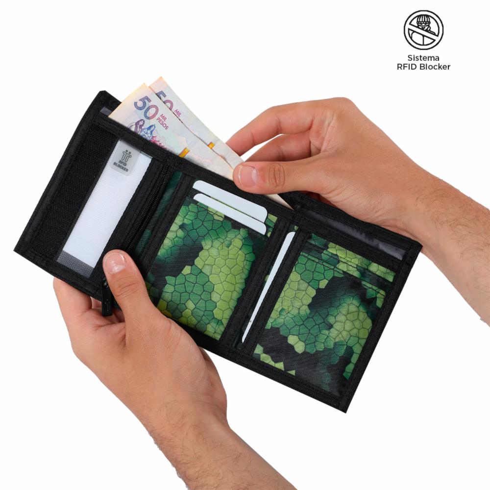 Lleva tus documentos y dinero a donde vayas con tu nueva billetera para hombre mediana, Tojal. Está hecha en 100% poliéster, y su estilo es de tres cuerpos