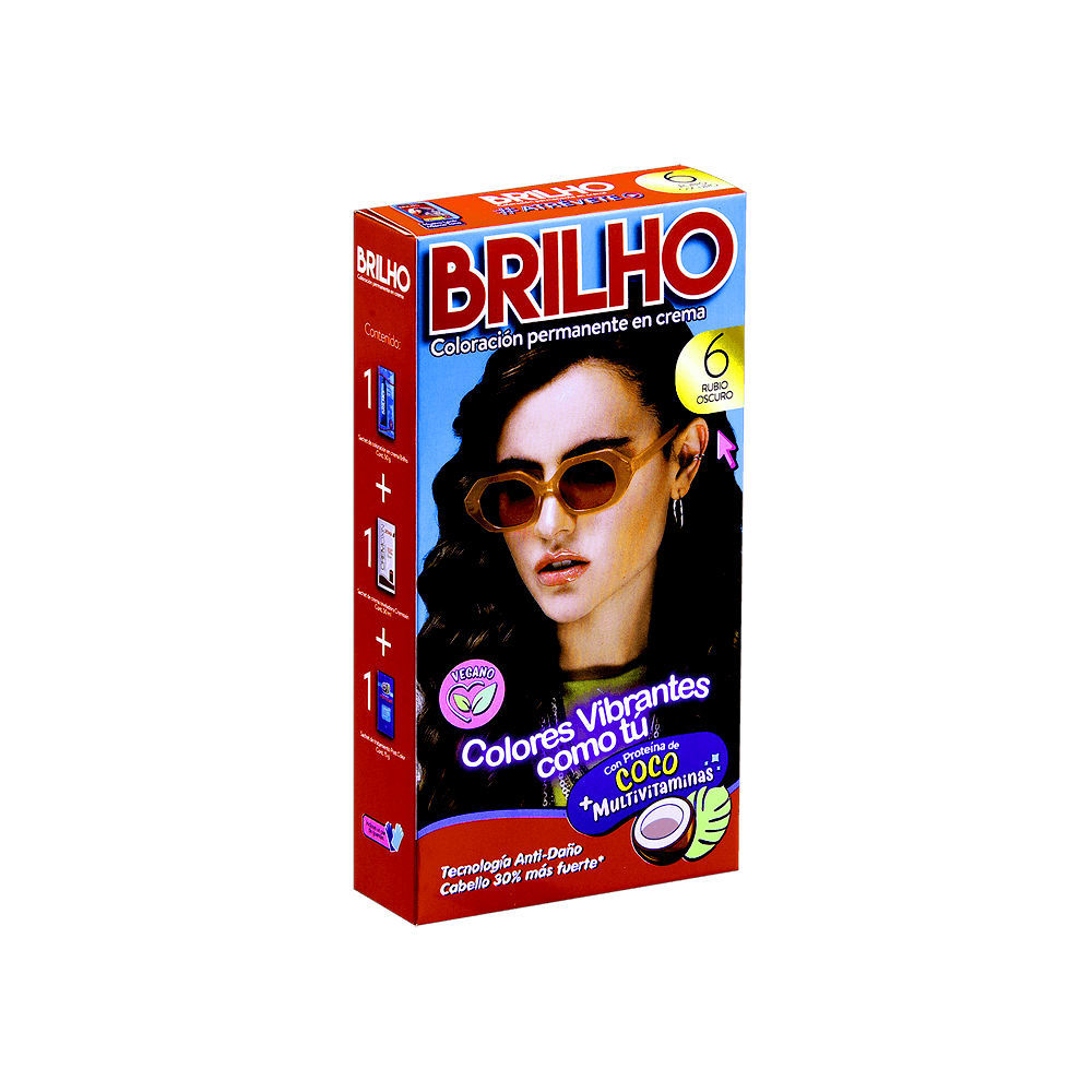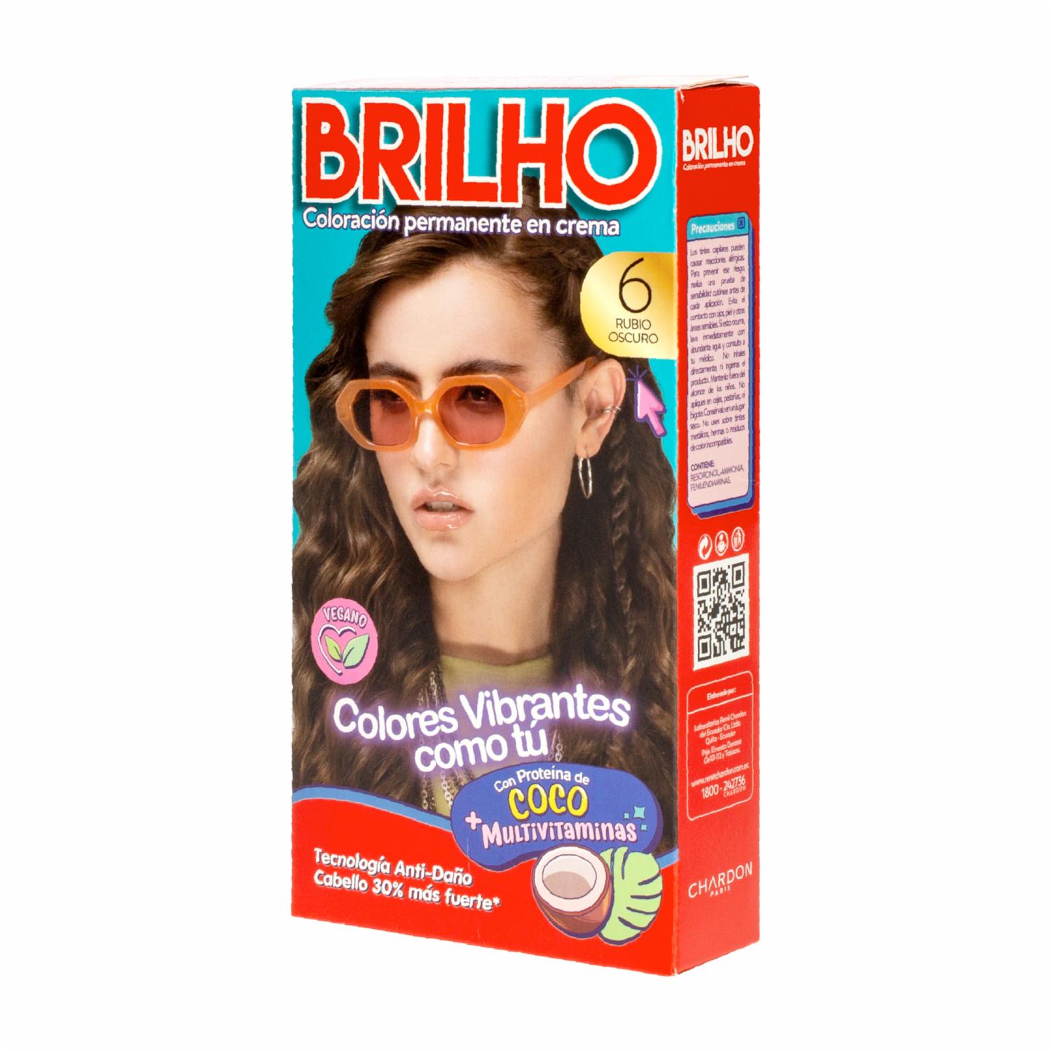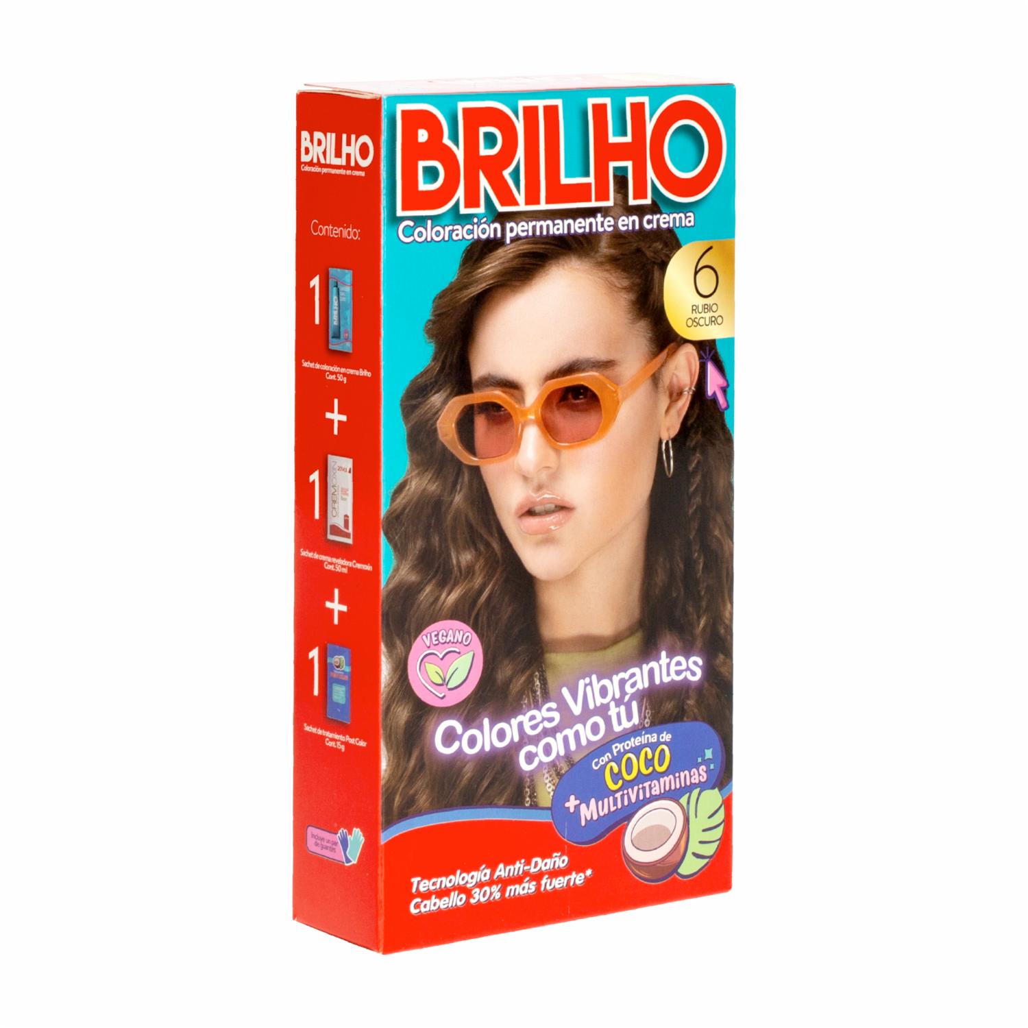 - El Tinte de Cabello Permanente en Crema Tono 6 Rubio Oscuro BRILHO de 50 g contiene proteína de coco y un complejo multivitamínico con tecnología anti-daño, que fortalece el cabello hasta un 30% más
