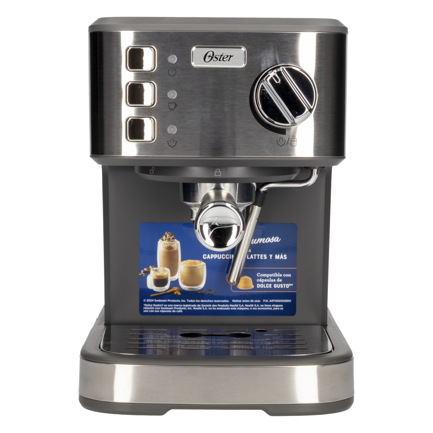- Cafetera compacta de espresso Oster® con diseño elegante en acero inoxidable, ideal para cualquier cocina. Compatible con cápsulas Dolce Gusto® y equipada con bomba italiana de 15 bar para espressos intensos. Cuenta con tubo de vapor ajustable para preparar capuccinos y lattes cremosos, además de tanque de agua extraíble para fácil llenado y limpieza