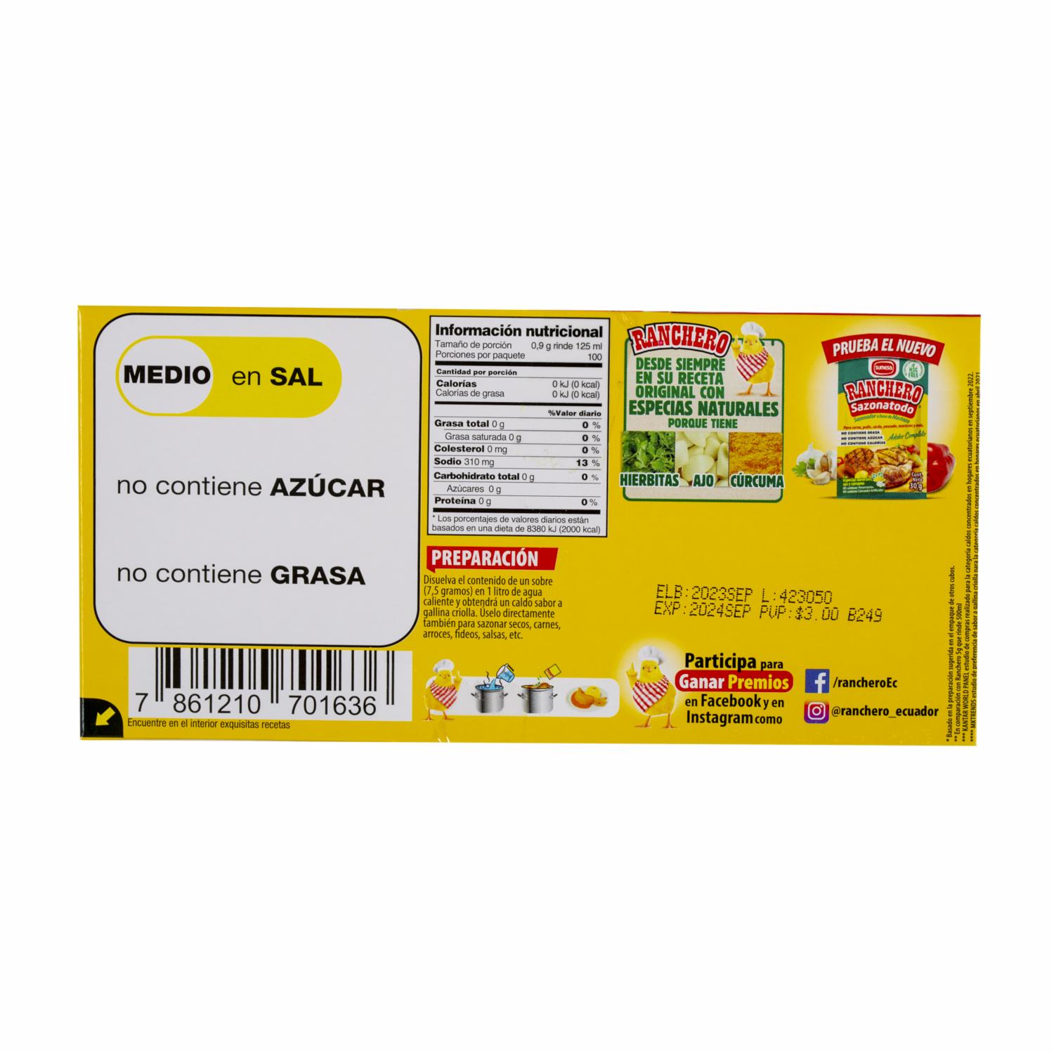 • El caldo de gallina en polvo Ranchero, en su presentación de 90 gramos, es un condimento concentrado que se utiliza comúnmente para realzar el sabor de diversas preparaciones culinarias