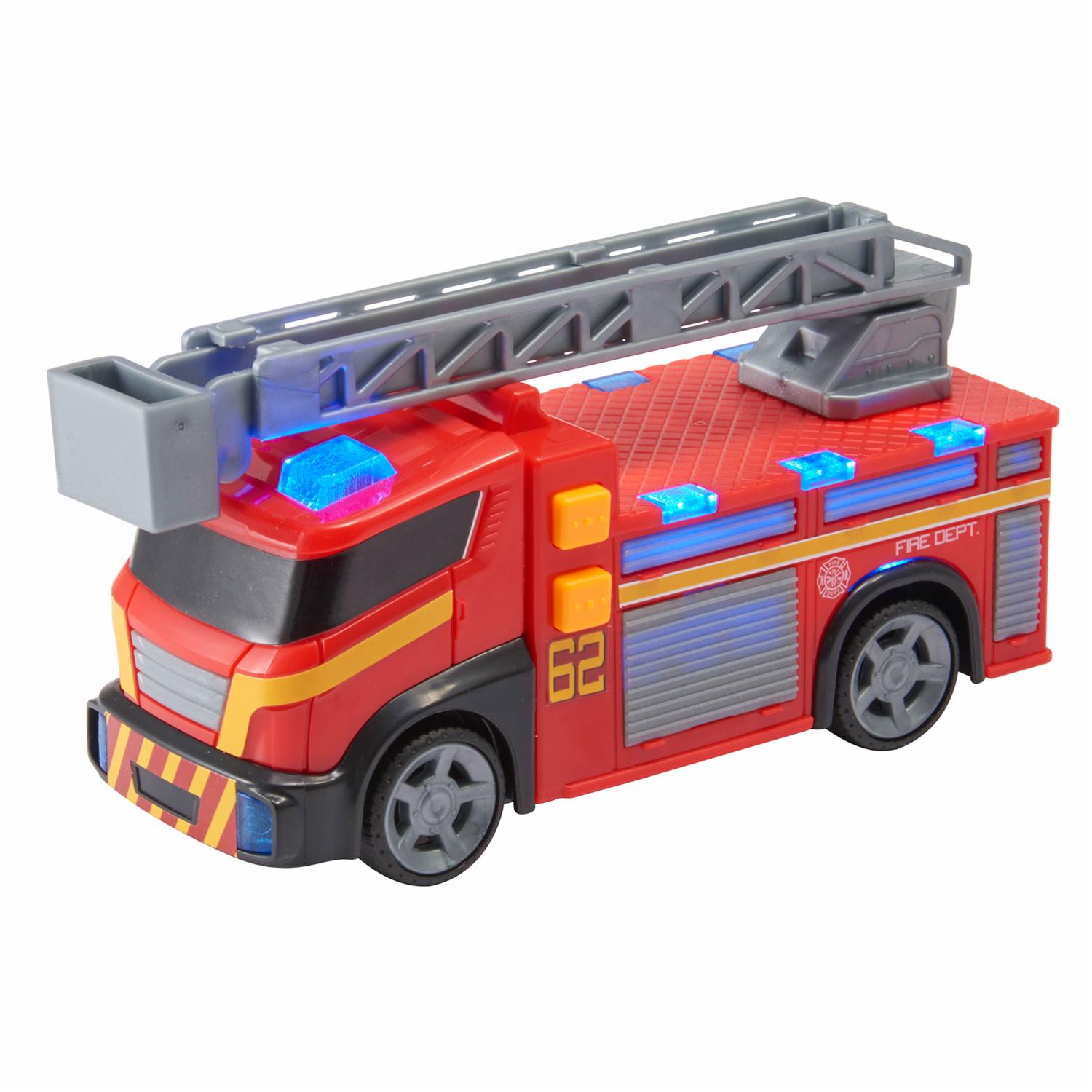 El pequeño camión de bomberos con luz y sonido fomenta el aprendizaje a través del juego. Cuneta con emocionantes luces de emergencia y sonidos de sirena, levanta la escalera, extiéndala y gire 360° para el rescate