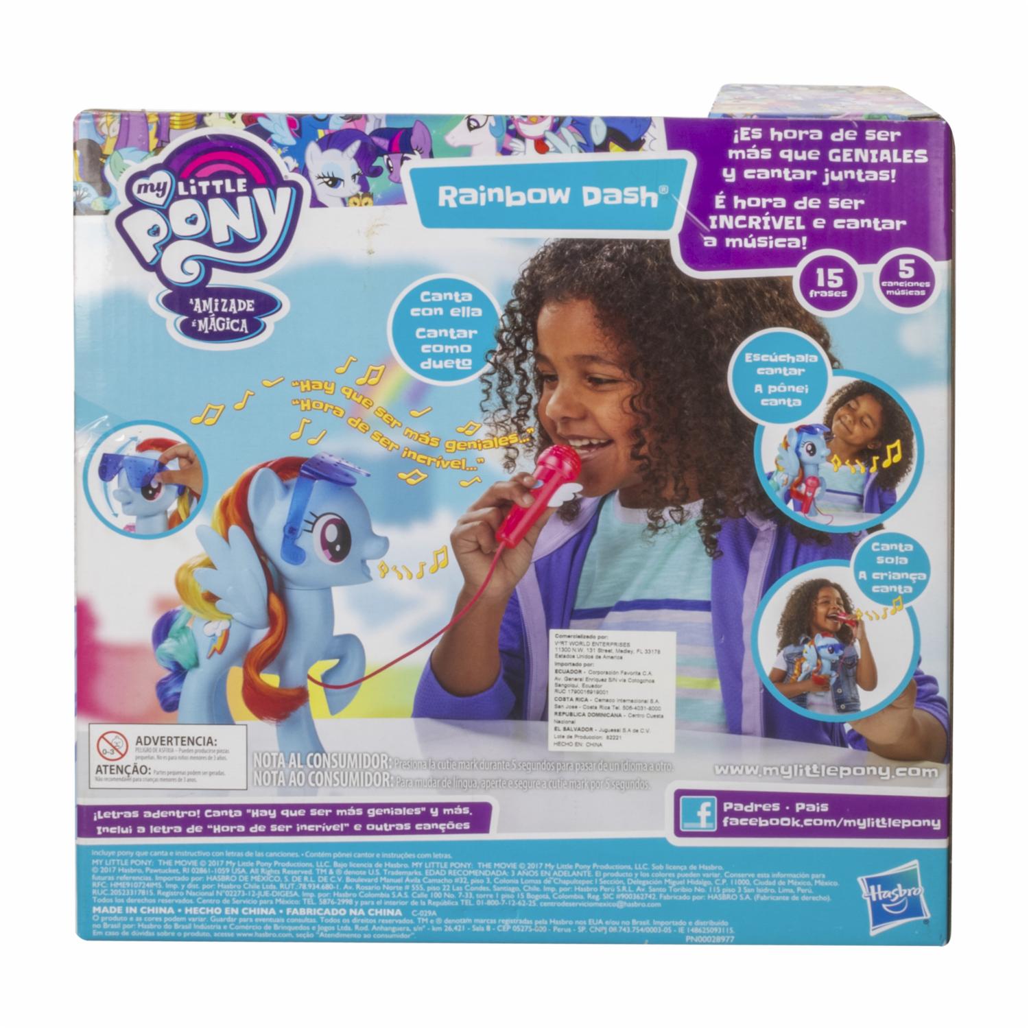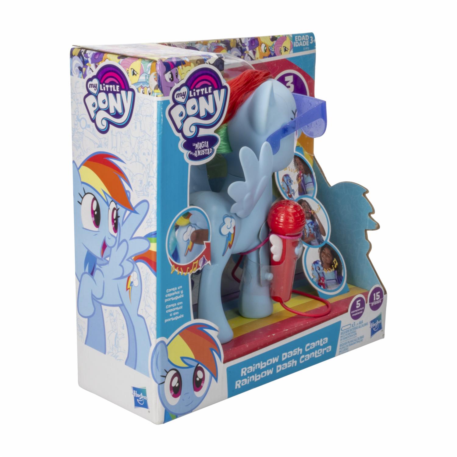- ¡La música y la magia se unen con Rainbow Dash Canta y Juega! Presiona su Cutie Mark para escuchar frases y cinco canciones del show. Usa el micrófono incluido para cantar en dúo o convertirla en altavoz. Con luces, sonidos y mucha actitud, ¡la diversión está lista para despegar al ritmo de la amistad! ¡Canta, brilla y juega en Juguetón, donde cada nota es una chispa de alegría y fantasía!