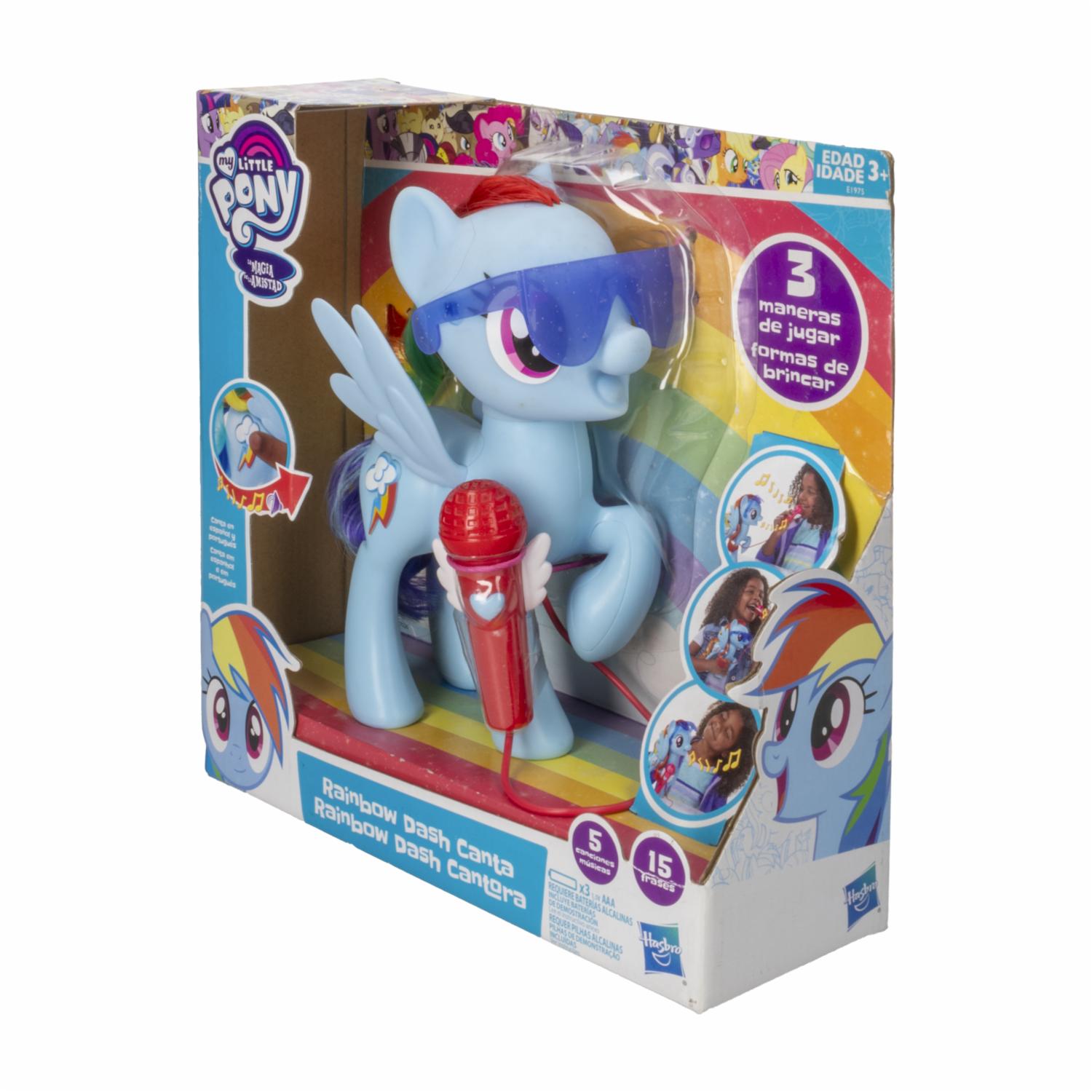 ¡La música y la magia se unen con Rainbow Dash Canta y Juega! Presiona su Cutie Mark para escuchar frases y cinco canciones del show. Usa el micrófono incluido para cantar en dúo o convertirla en altavoz. Con luces, sonidos y mucha actitud, ¡la diversión está lista para despegar al ritmo de la amistad! ¡Canta, brilla y juega en Juguetón, donde cada nota es una chispa de alegría y fantasía!