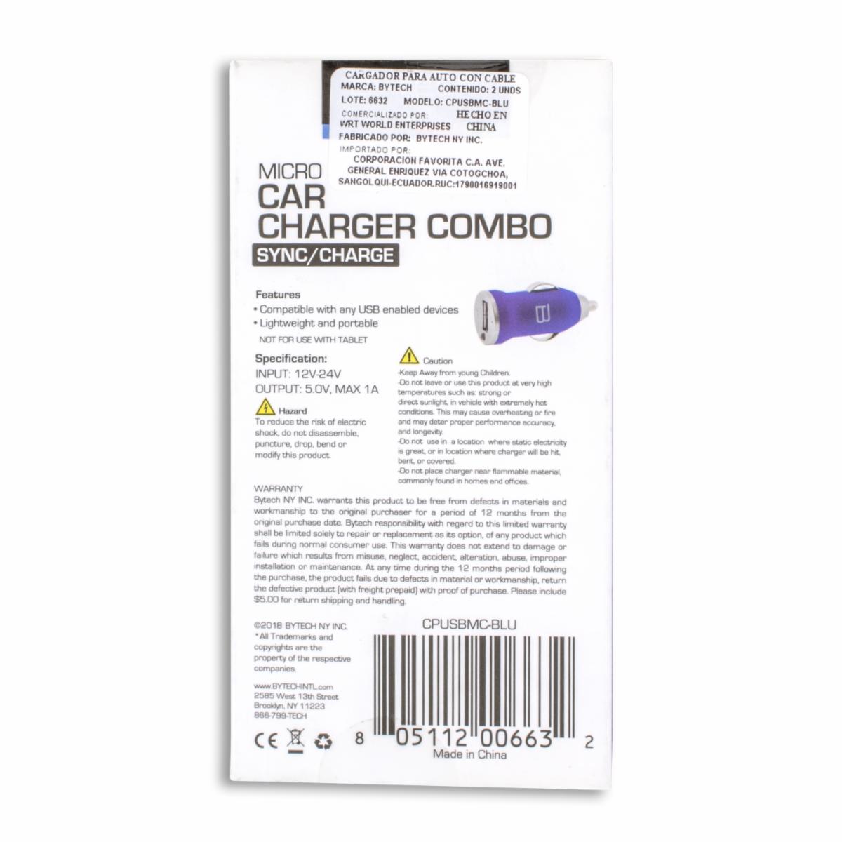 Cargador Para Auto USB + Mini Cable De Carga BYTECH 1 Amp