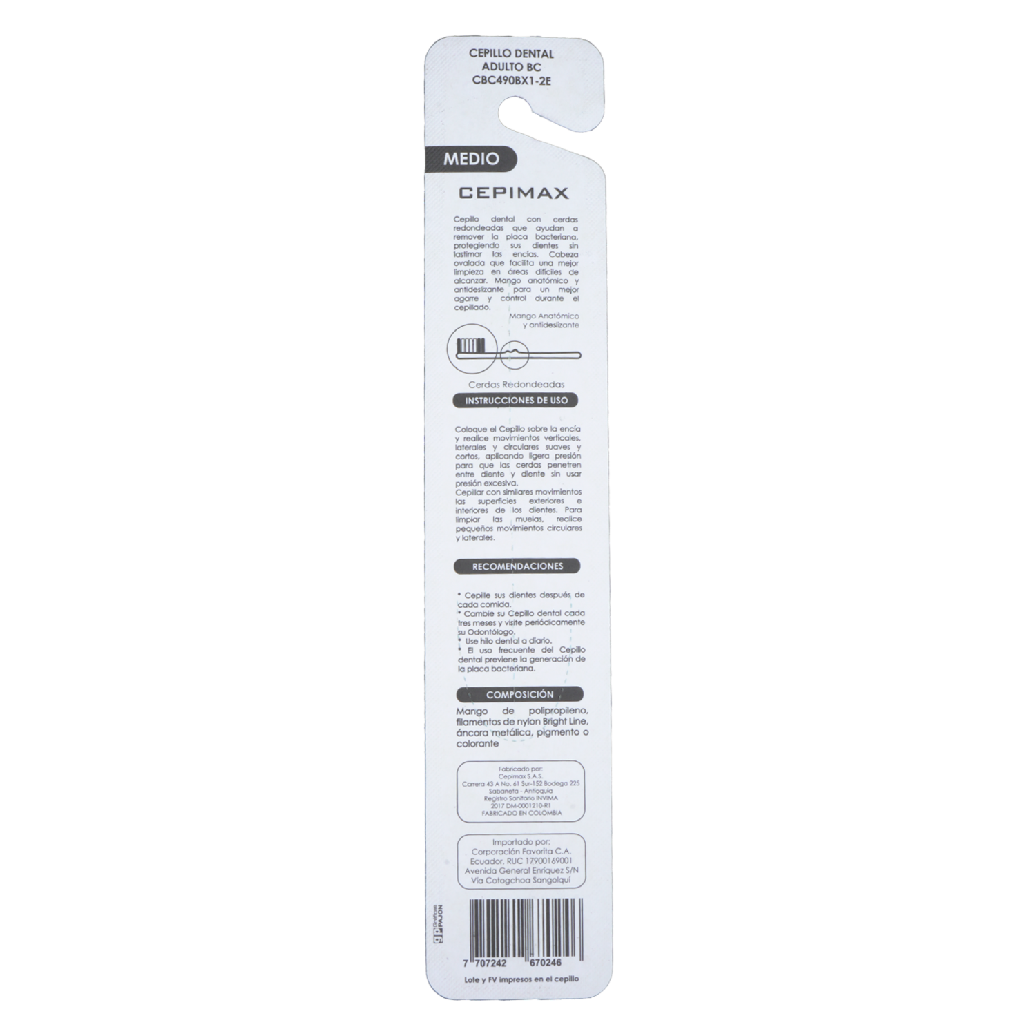 - El cepillo dental para adultos 490 Bc con cerdas medianas es un producto diseñado para la higiene bucal