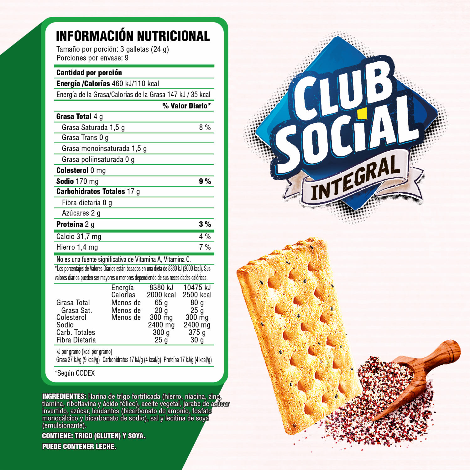 - Galletas Saladas Club Social con Multigranos 6pack x 24g c/u con harina de trigo integral, cañihua, kiwicha (amaranto), quinua y chía