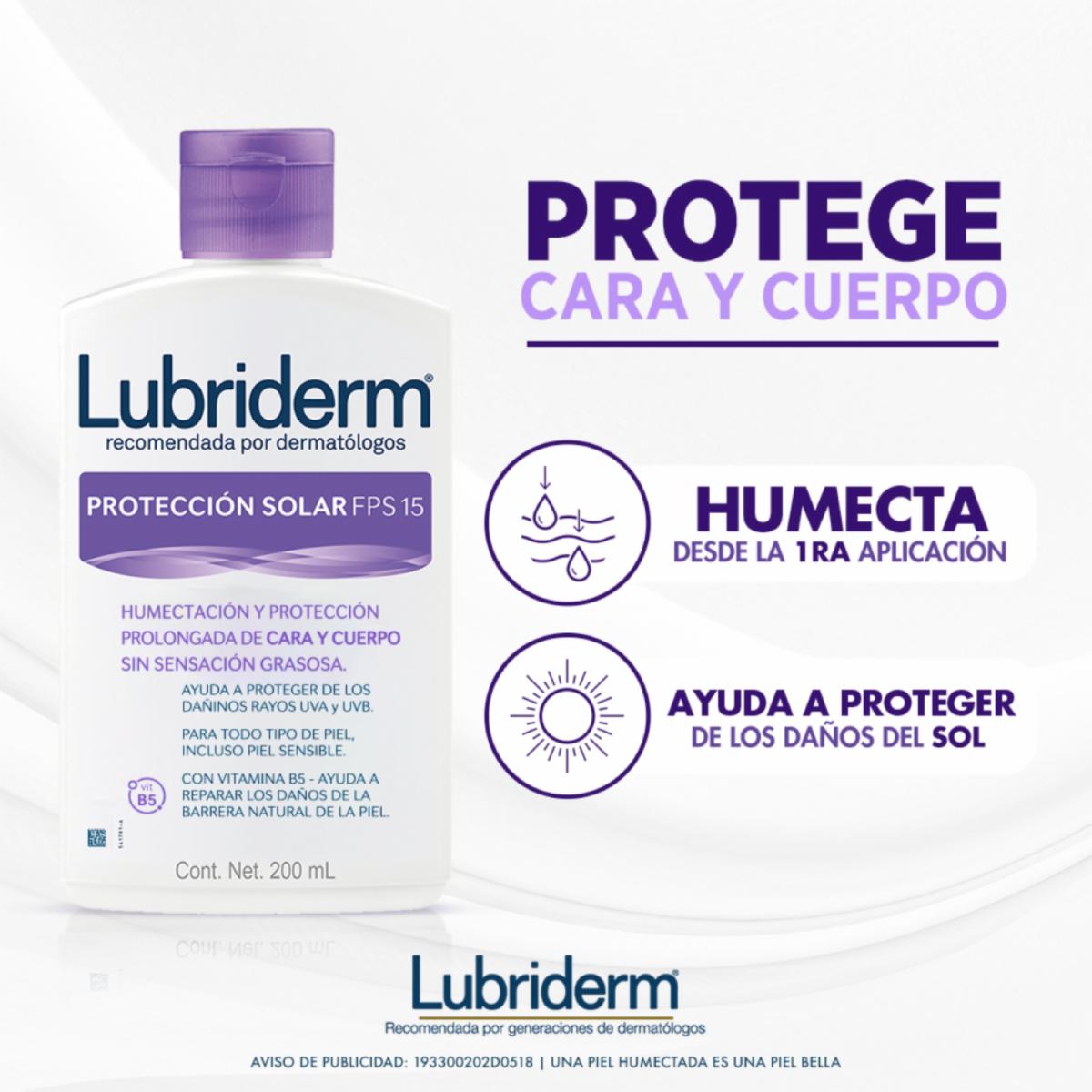 LUBRIDERM®, la marca recomendada por dermatólogos, humecta y protege la piel de los dañinos rayos del sol gracias a su factor de protección FPS 15 de amplio espectro, que protege de los rayos UVB (que penetran la capa superficial de la piel) y los UVA (que penetran las capa media y profunda de la piel)