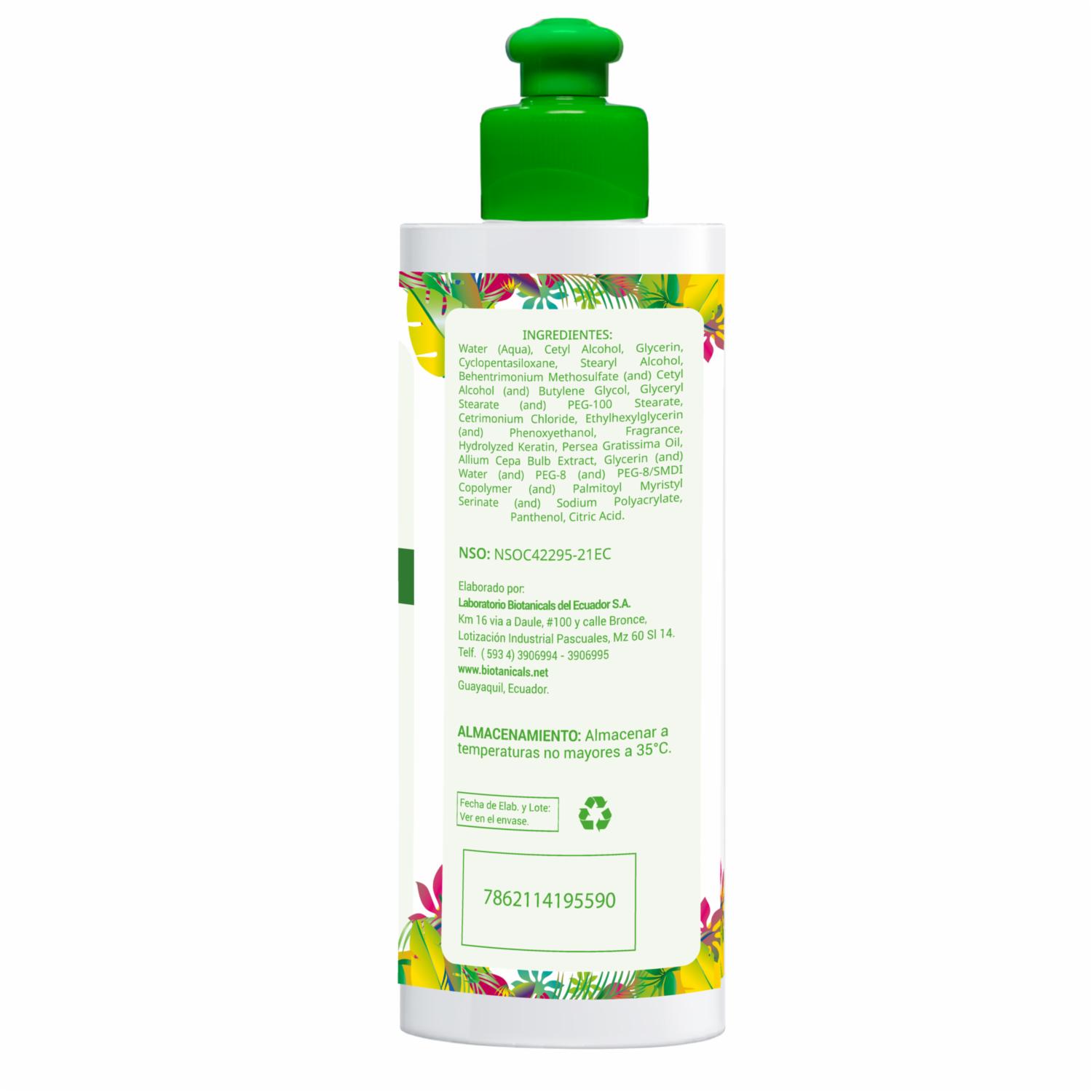 - Agentes Antiestáticos, Aceite de Aguacate, Extracto de Cebolla y Panthenol (Pro-Vitamina B5) que juntos favorecen el fortalecimiento de sus cabellos y por ende previenen la caída prematura al mantenerlos humectados, nutridos, sedosos, sin enredos, con brillo, color y salud natural