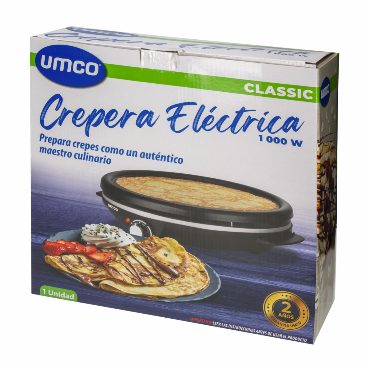 - La Crepera Eléctrica UMCO de 1000 Watts es una herramienta ideal para hacer crepes en casa de forma rápida y sencilla. Con una potencia de 1000 Watts, esta crepera es capaz de calentarse rápidamente y distribuir el calor de manera uniforme, lo que garantiza que tus crepes queden perfectamente cocidos