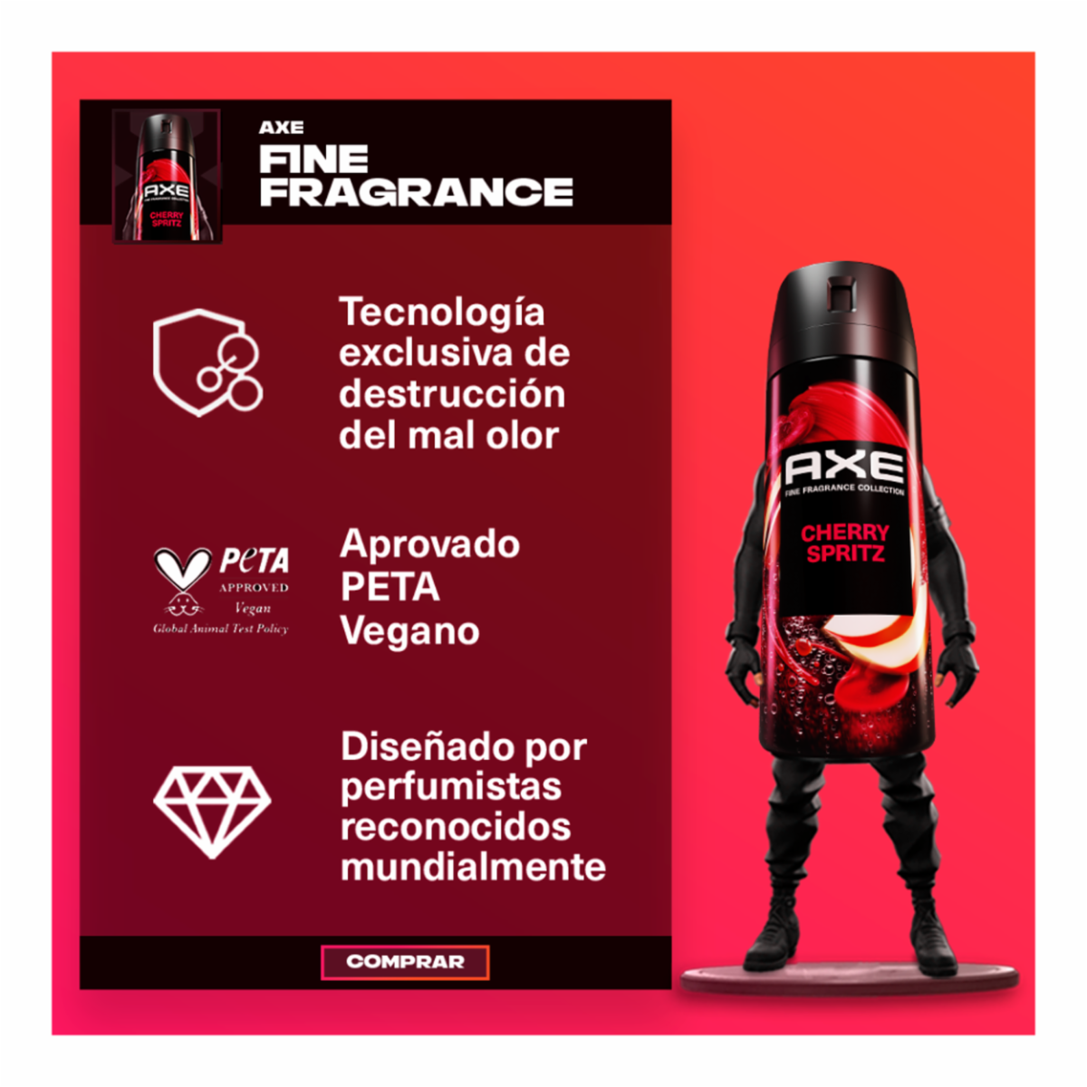 - Desodorante en aerosol AXE Cherry Spritz de 150 ml. Fragancia intensa y fresca con notas frutales, ideal para mantenerte protegido y perfumado todo el día