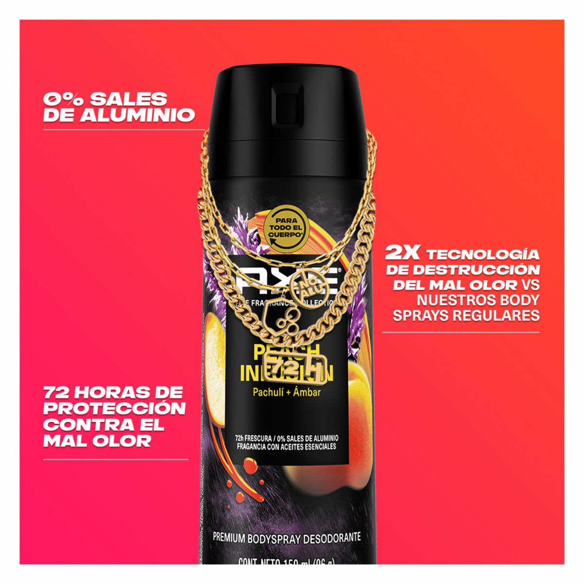 Desodorante en aerosol AXE Peach Infusion de 150 ml. Aroma elegante y refrescante con esencia de durazno, brindando protección y frescura prolongada