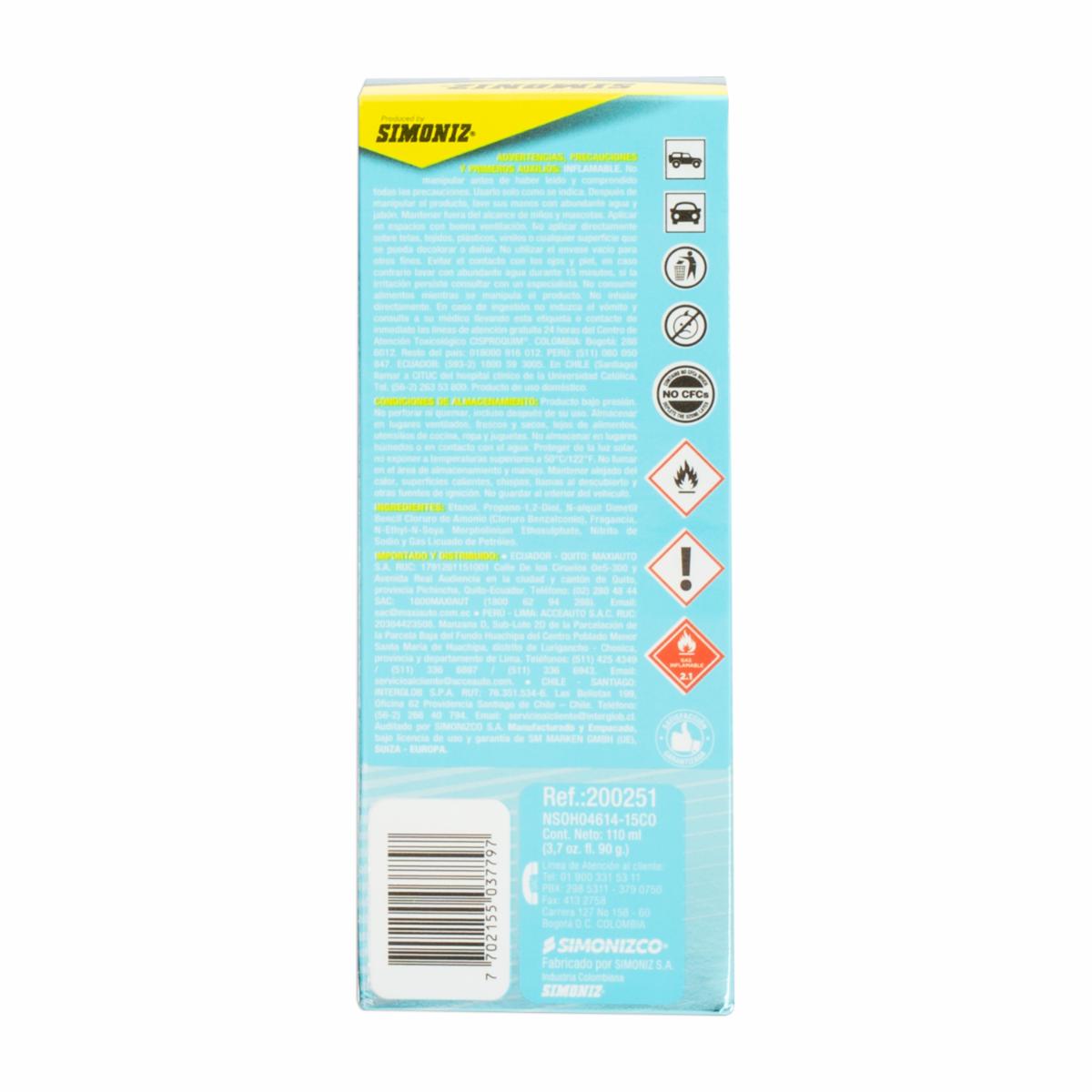 - El Eliminador De Olores Complete Air System De Simoniz En Presentación De 110 Ml Es Un Producto Diseñado Para Neutralizar Y Eliminar Olores Indeseados En El Interior De Vehículos Y Espacios Cerrados. La Marca Simoniz Es Reconocida Por Ofrecer Productos De Cuidado Automotriz Y De Limpieza De Alta Calidad, Y El Eliminador De Olores Complete Air System No Es La Excepción