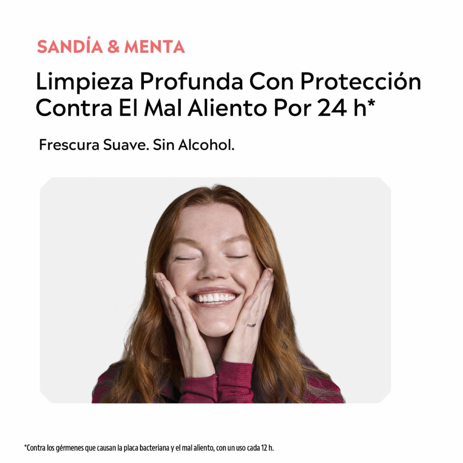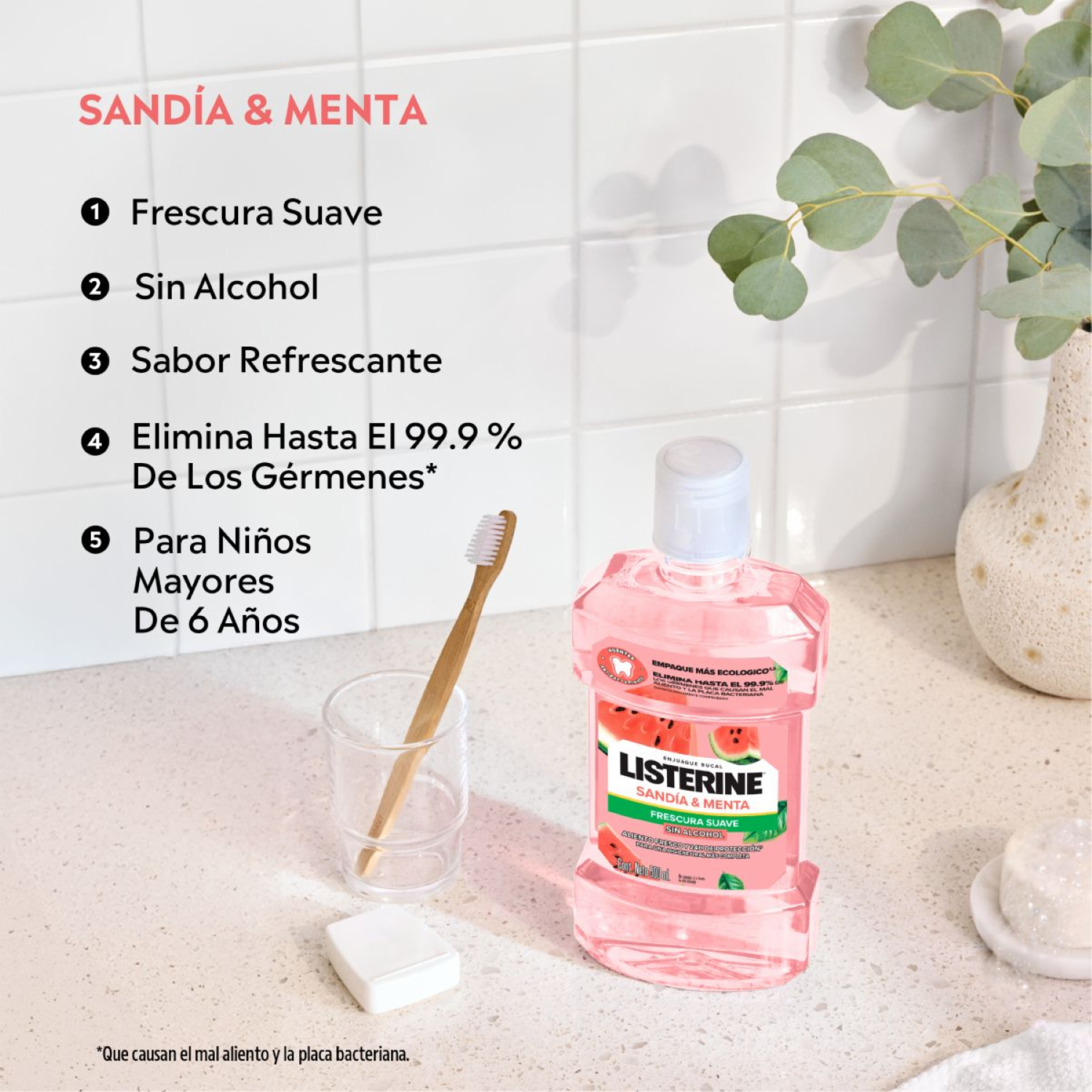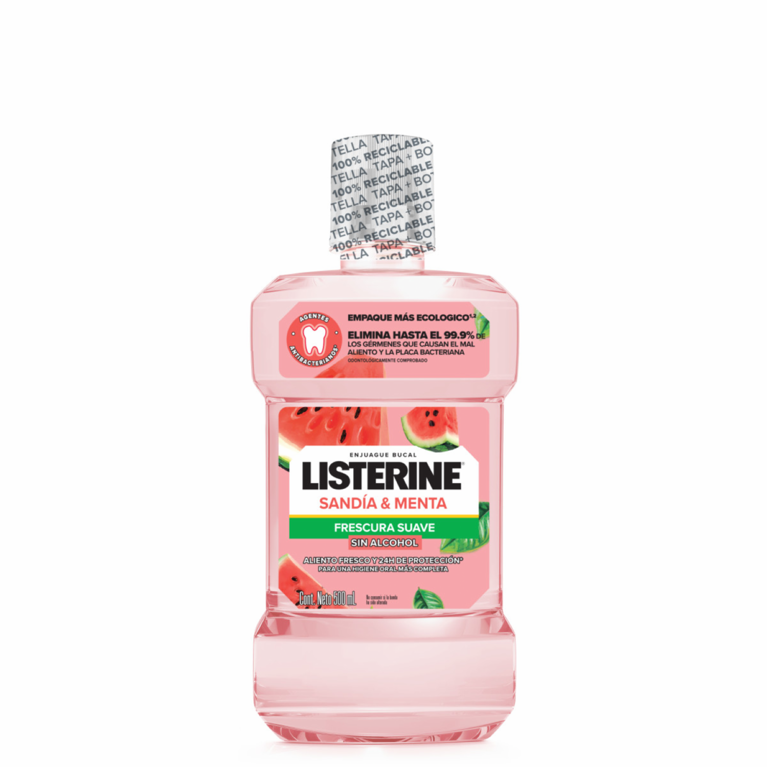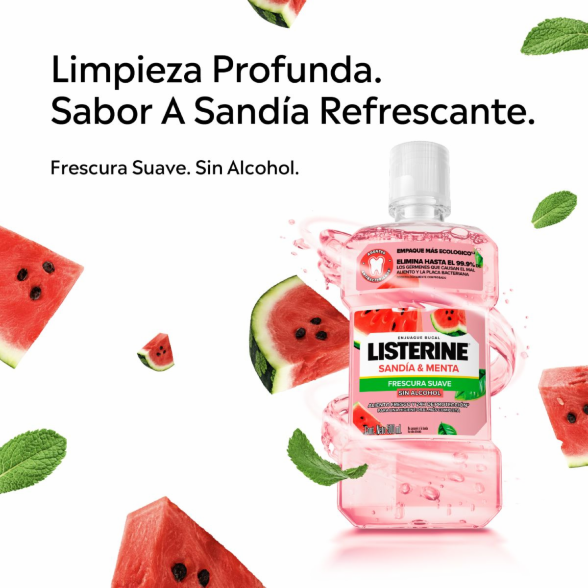 - LISTERINE SANDIA & MENTA elimina hasta el 99.9% de los gérmenes que causan el mal aliento y la placa bacteriana. Brindando 24 horas de protección, para una higiene bucal completa. Protección contra los gérmenes que causan la placa bacteriana y mal aliento, con un uso cada 12h
