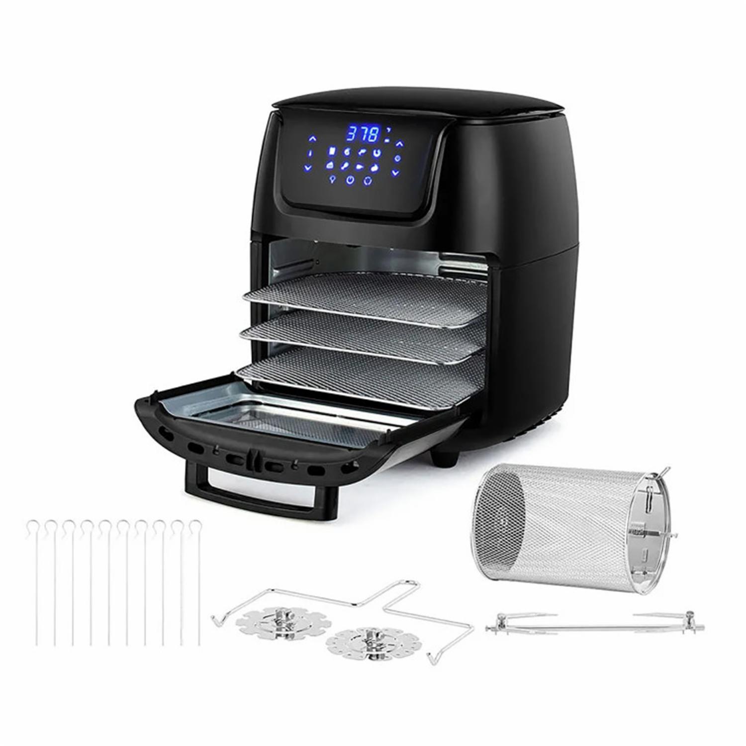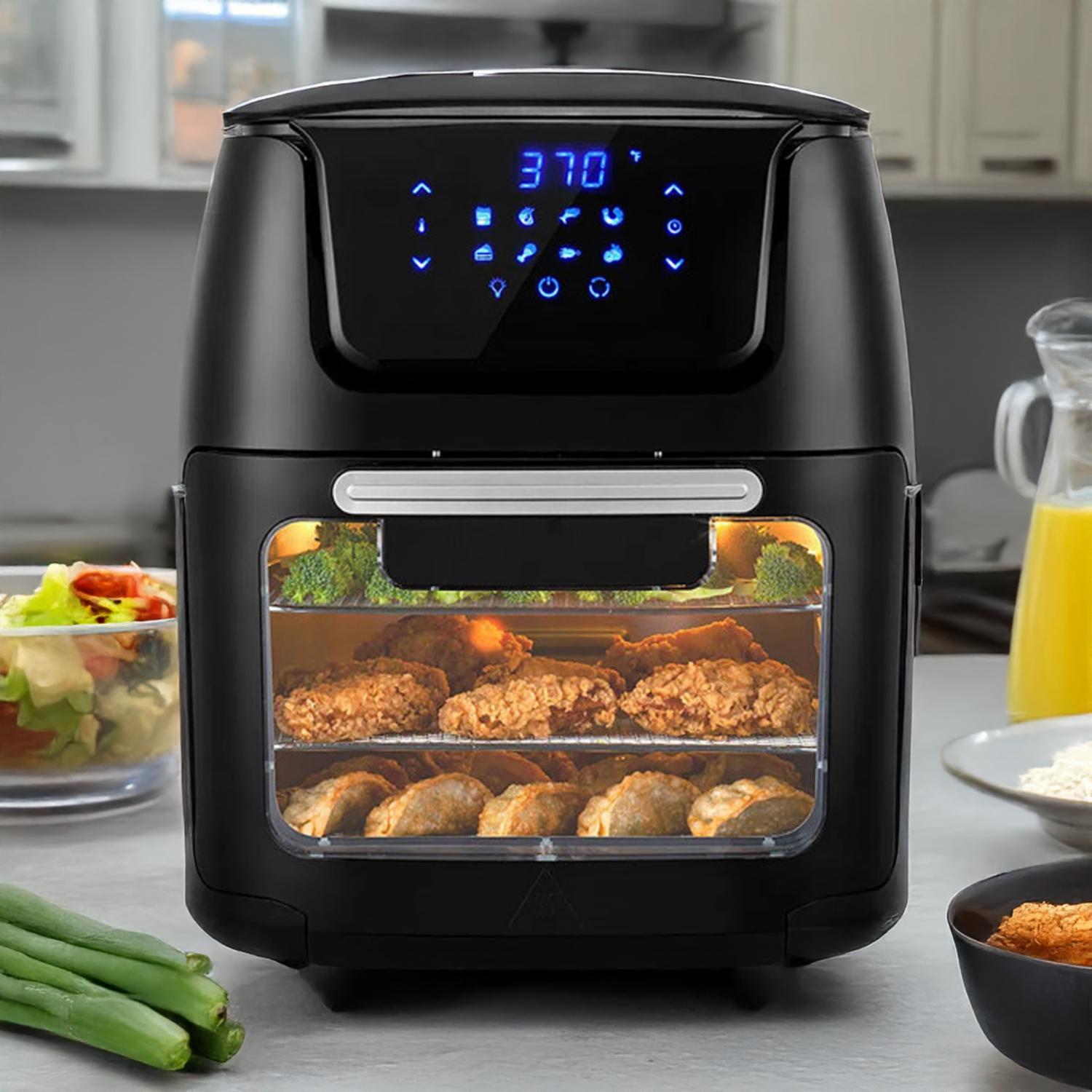 • - Amplia capacidad de 12 litros con 3 niveles para aprovechar el espacio al máximo. - Temporizador de 60 minutos con apagado automático para evitar la sobrecocción. - Control de temperatura ajustables hasta 200°C / 390°F. - Panel de control digital