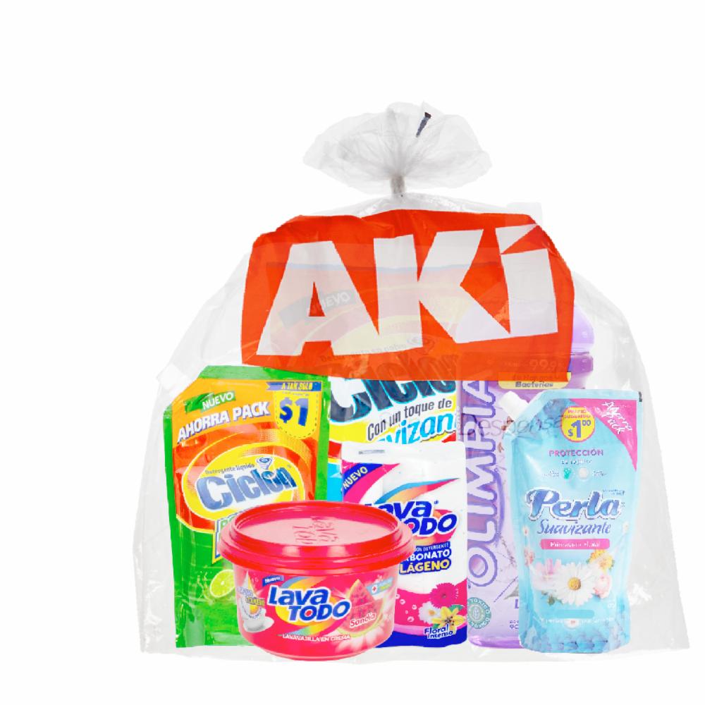 La funda económica de limpieza de AKÍ incluye productos La Fabril para mantener tu hogar impecable. Contiene LAVATODO jabón para ropa con fragancia floral (240g), PERLA suavizante primavera floral en doy pack (400ml), CICLON detergente líquido poder limón en doy pack, LAVATODO BRILLEX lavavajillas con aroma a sandía, OLIMPIA desinfectante con aroma a lavanda y CICLON detergente en polvo con suavizante
