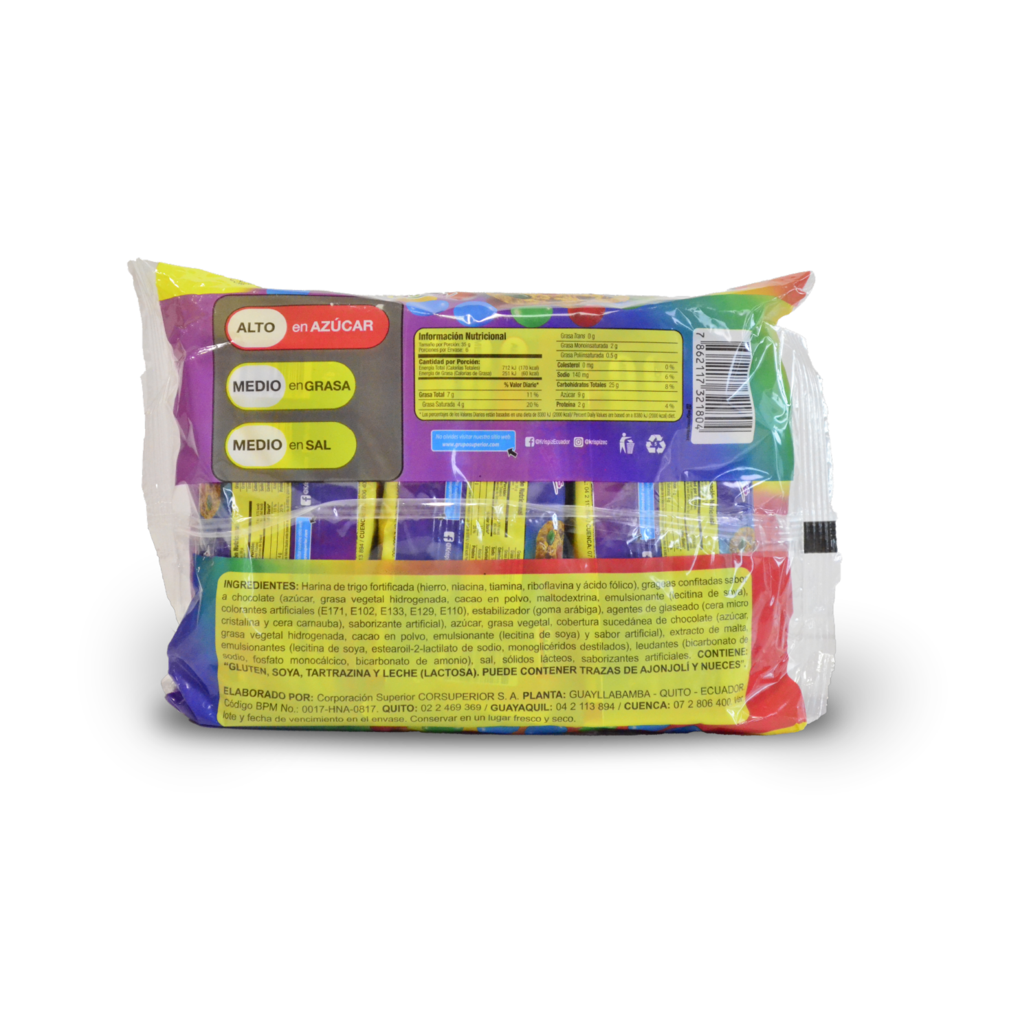 • Krispiz Arcoiris, deliciosa galleta horneada de vainilla con chispas de chocolate y full grajeas de chocolates de colores