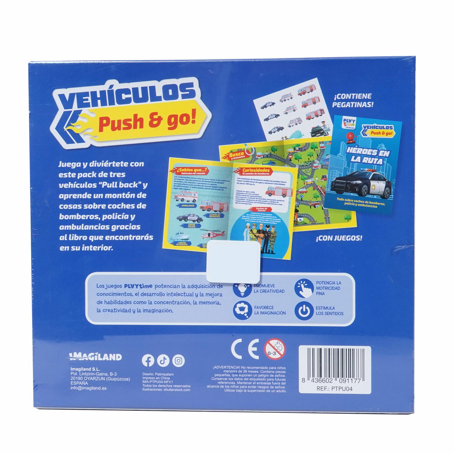 - Juega y diviértete con este pack de tres vehículos "Pull back" y aprende un montón de cosas sobre coches de bomberos, policía y ambulancias gracias al libro que encontrarás en su interior