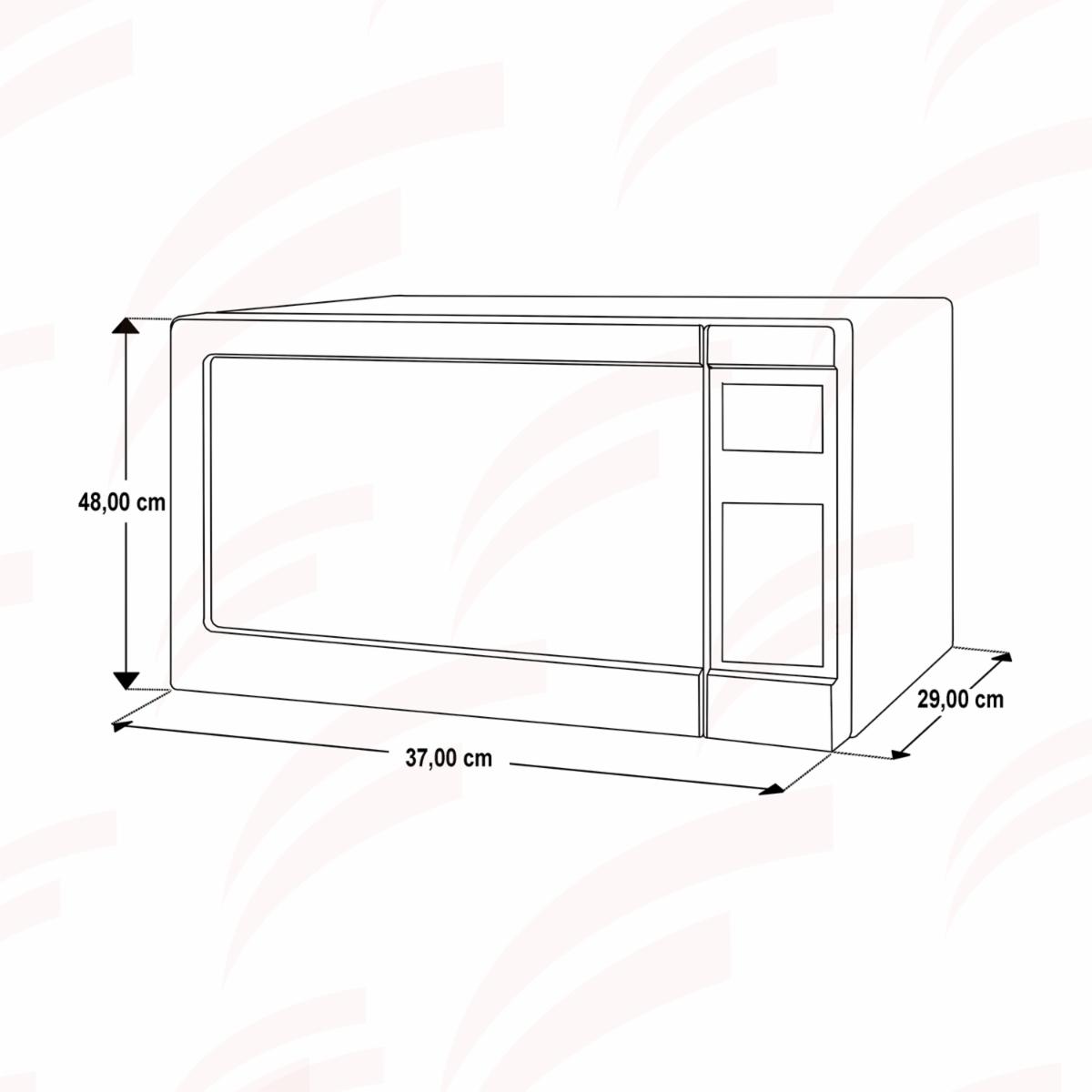 - -10 niveles de potencia -Botón de palomitas -Función de añadir tiempo adicional -Inicio rápido de 30 segundos -Reloj -Panel digital -Luz interna -Puerta accionable con botón -Plato giratorio -Bloqueo de seguridad para niños