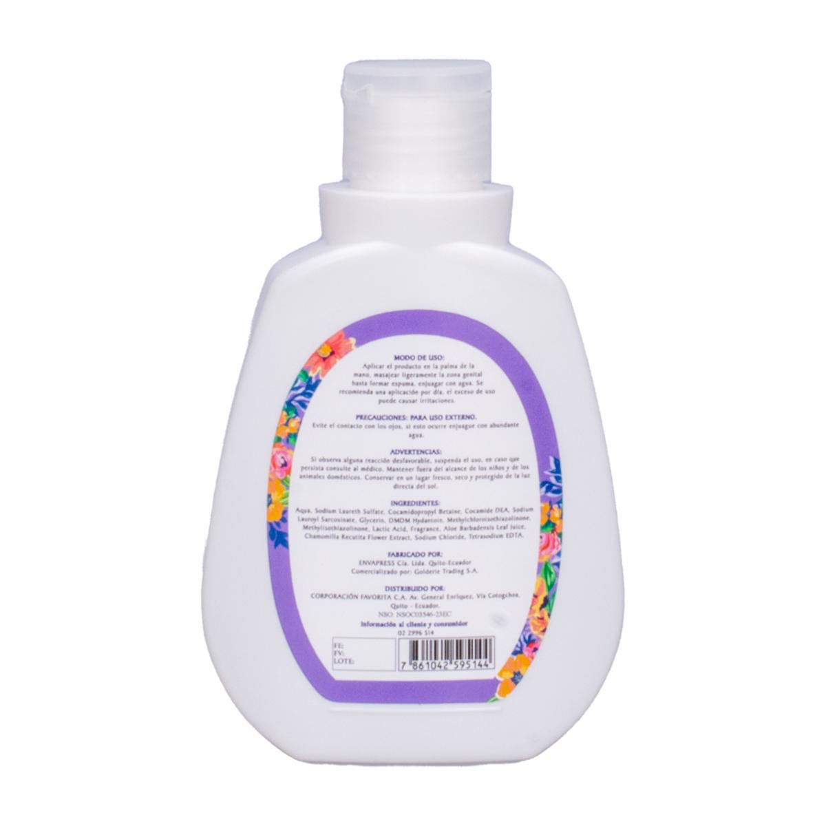 Jabón íntimo femenino hidrata protege y refresca con aloe vera, extracto de manzanilla y ácido láctico. Ph balanceado y libre de alcohol