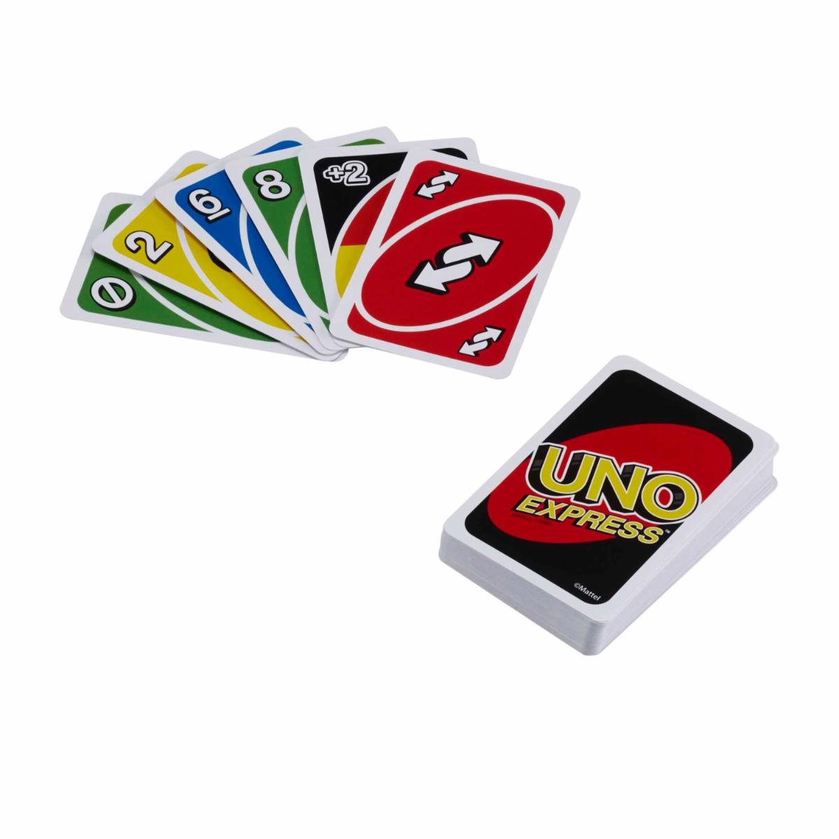 - UNO Express ofrece toda la diversión de UNO, pero con una dinámica de juego más rápida; la baraja más pequeña hace que esta versión sea portátil y fácil de llevar a todos lados. Los jugadores toman turnos para hacer pares con una carta en su lote, con la carta que se muestra en la parte superior de la baraja, ya sea por su color o su número