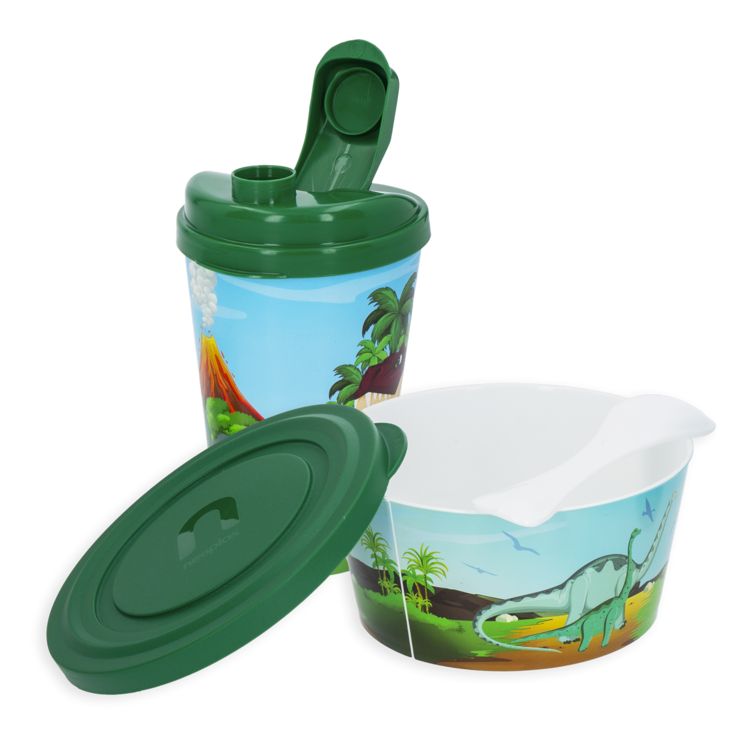 - Haz que la hora del almuerzo sea divertida con el kit NEOPLAS de dinosaurio. Incluye vaso y repostero resistentes y prácticos