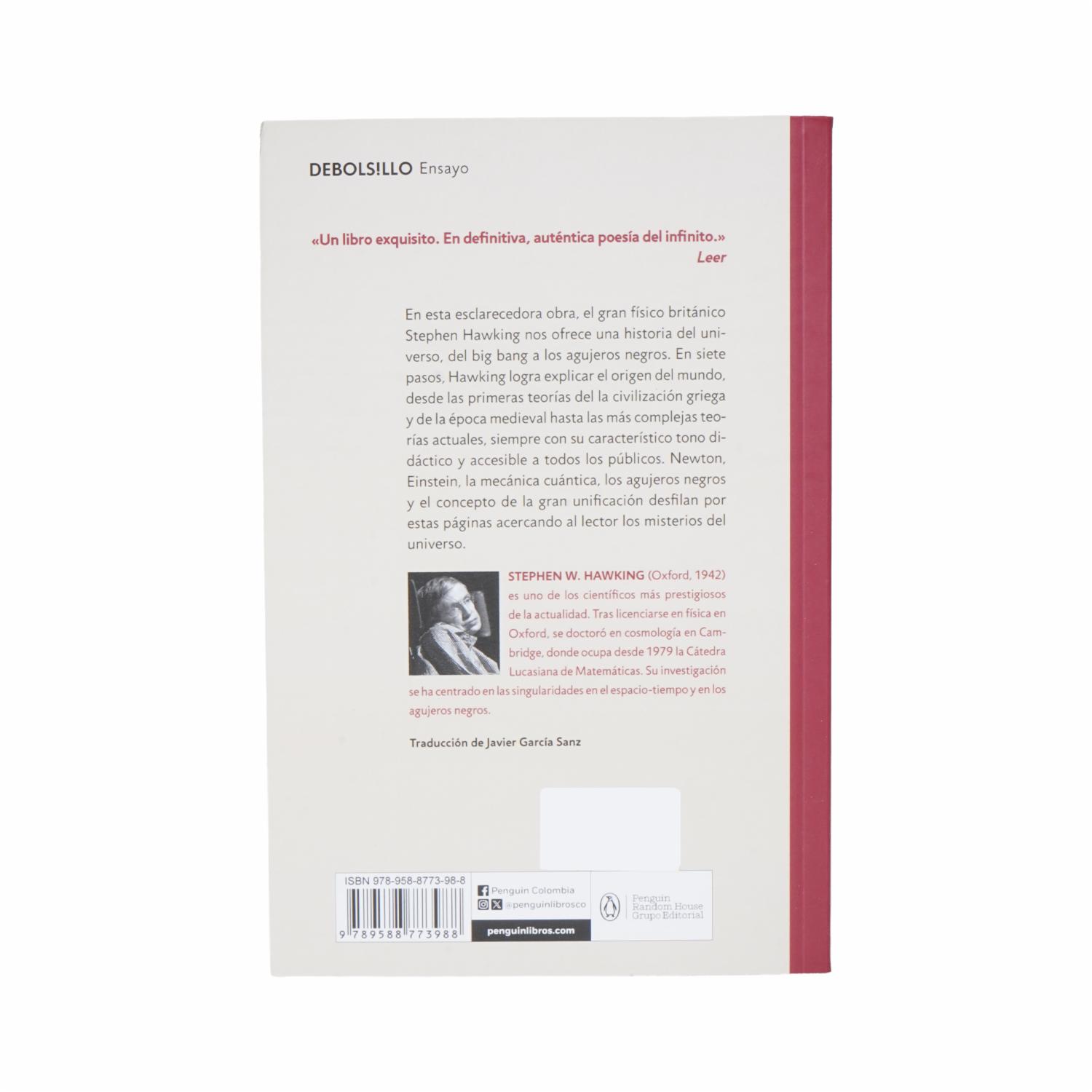 - En esta esclarecedora obra, el gran físico británico Stephen Hawking nosofrece una historia del universo, del big bang a los Agujeros negros. En siete pasos, Hawking logra explicar la historia del universo, desde las primeras teorías del mundo griego y de la época medieval hasta las más complejas teorías actuales, siempre con su característico tono didáctico y accesible a todos los públicos