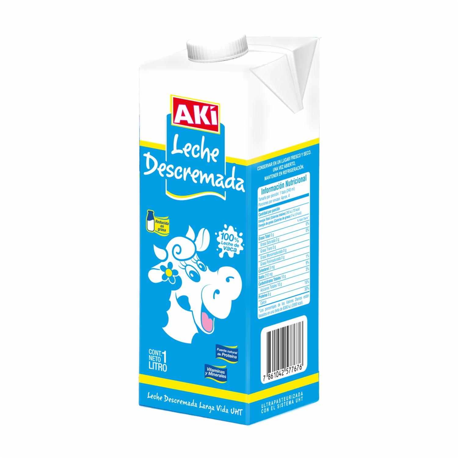 - La leche descremada en tetrapack de AKI es una opción láctea que ha sido sometida a un proceso de descremado para reducir su contenido de grasa. Suele tener un menor porcentaje de grasa en comparación con la leche entera, lo que la hace popular entre aquellos que buscan una opción más ligera