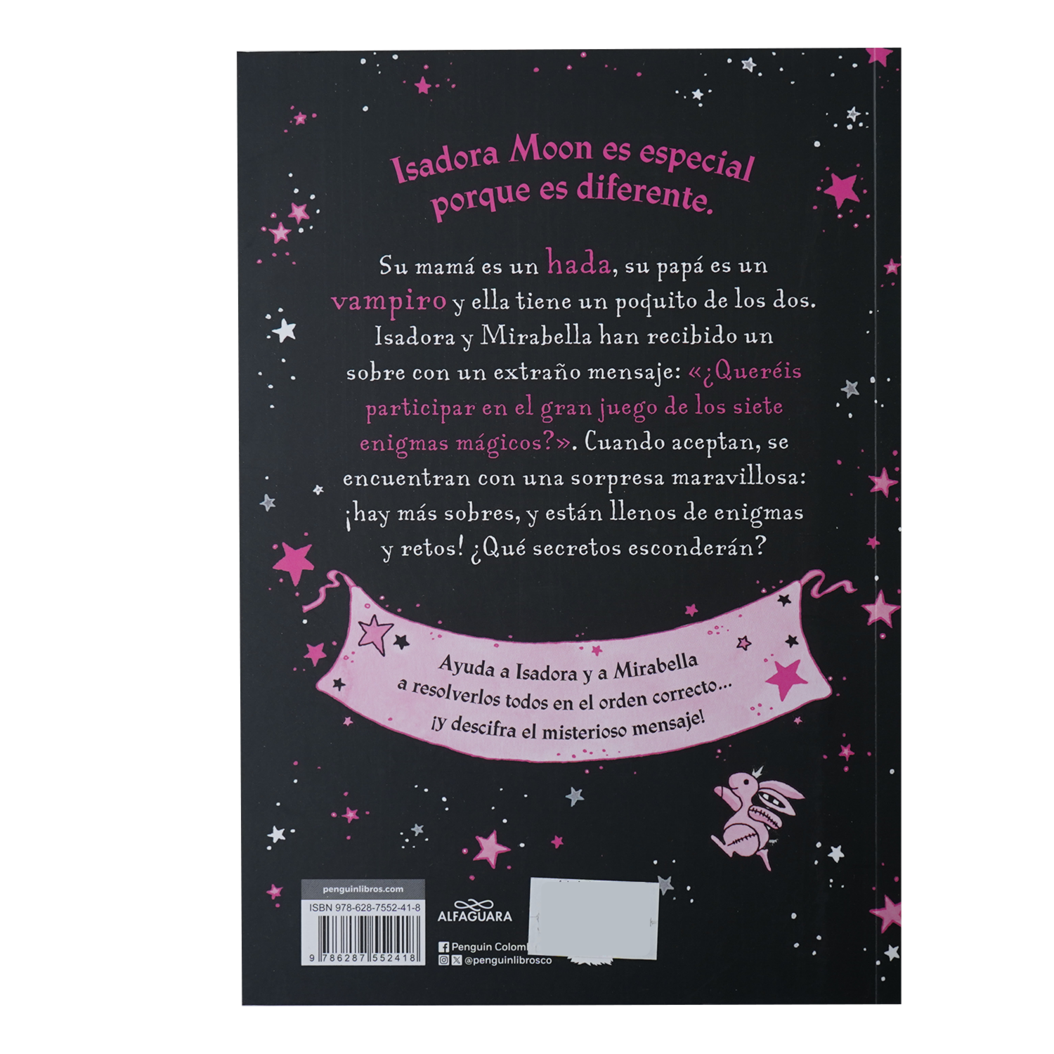 • Mitad hada, mitad vampiro, ¡totalmente única! Isadora Moon es especial porque es diferente. Su mamá es un hada, su papá es un vampiro y ella tiene un poquito de los dos. Isadora y Mirabella han recibido un sobre con un extraño mensaje: "¿Queréis participar en el gran juego de los siete enigmas mágicos?"