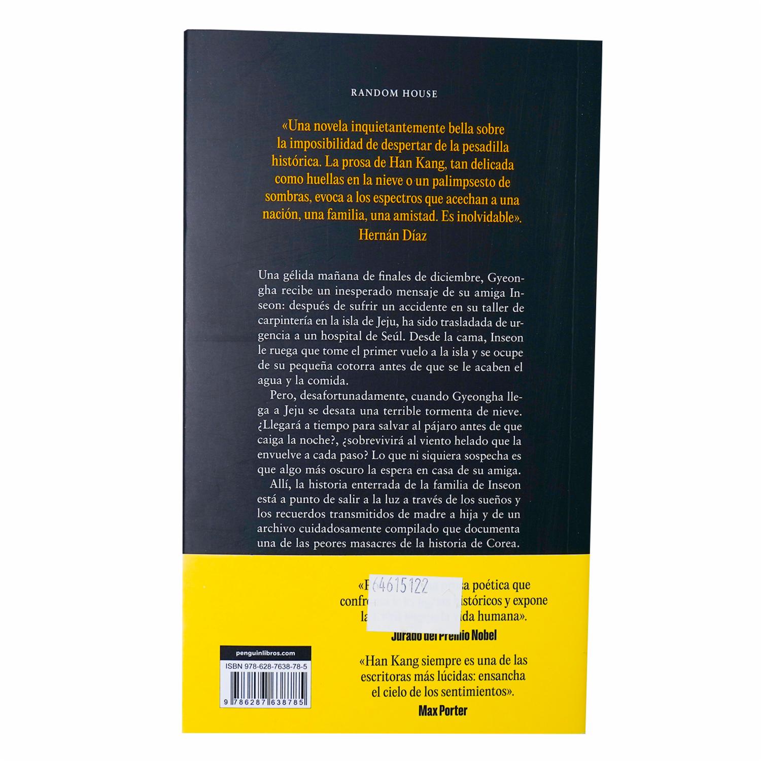 - Una gélida mañana de finales de diciembre, Gyeongha recibe un inesperado mensaje de su amiga Inseon: después de sufrir un accidente en su taller de carpintería en la isla de Jeju, ha sido trasladada de urgencia a un hospital de Seúl. Desde la cama, Inseon le ruega que tome el primer vuelo a la isla y se ocupe de su pequeña cotorra antes de que se le acaben el agua y la comida