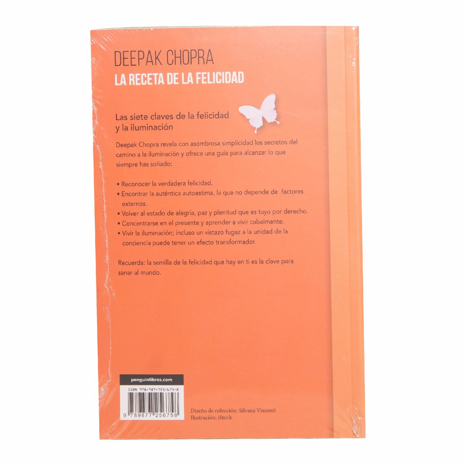 - En La receta de la felicidad, Deepak Chopra revela siete claves para alcanzar una felicidad duradera, más allá del éxito o las circunstancias externas. A través de principios espirituales y ejercicios prácticos, nos guía a reconectar con nuestra verdadera esencia, cultivar la paz interior y vivir con plenitud. Un camino transformador hacia la alegría que habita en cada uno de nosotros