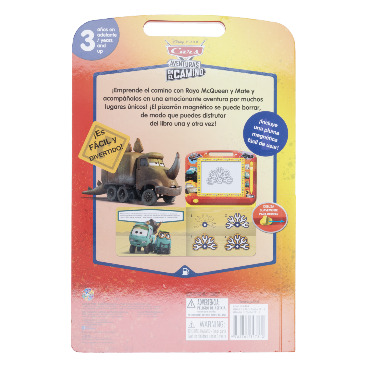 Emprende el camino con Rayo McQueen y Mate, acompáñalos en una emocionante aventura por muchos lugares únicos. El pizarrón magnético se puede borrar, de modo que puedes disfrutar del libro una y otra vez