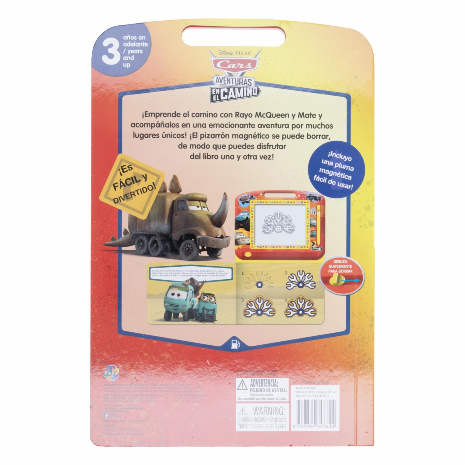 - Emprende el camino con Rayo McQueen y Mate, acompáñalos en una emocionante aventura por muchos lugares únicos. El pizarrón magnético se puede borrar, de modo que puedes disfrutar del libro una y otra vez