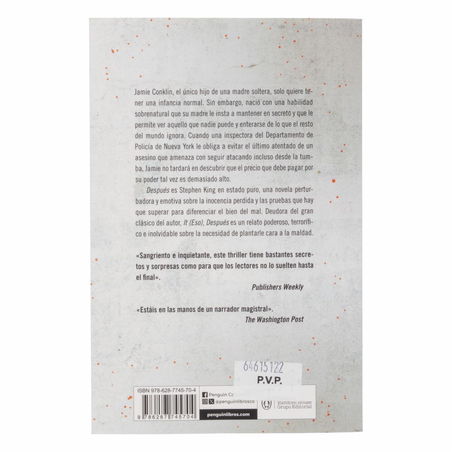 consultando preciosLibro Stephen King Después DEBOLSILLO 244 Páginas – DEBOLSILLO. Disponible en nuestros locales. Precio y stock pueden variar según la tienda.