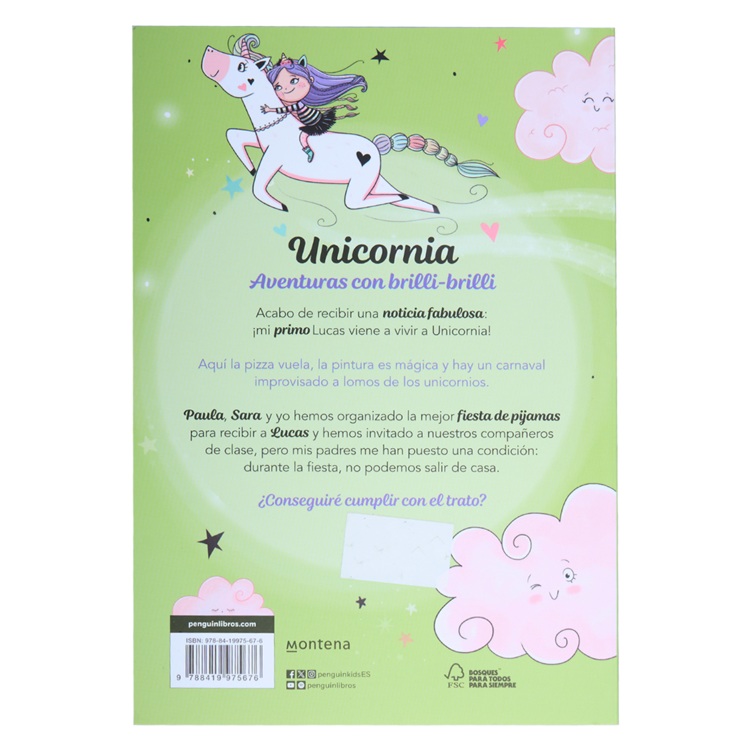 Acabo de recibir una noticia fabulosa... ¡mi primo Lucas se viene a vivir a Unicornia! Aquí la pizza vuela, la pintura es mágica y hay un carnaval improvisado a lomos de los unicornios. Paula, Sara y yo hemos organizado la mejor fiesta de pijamas para recibir a Lucas y hemos invitado a nuestros compañeros de clase, pero mis padres me han puesto una condición: durante la fiesta, no podemos salir de casa
