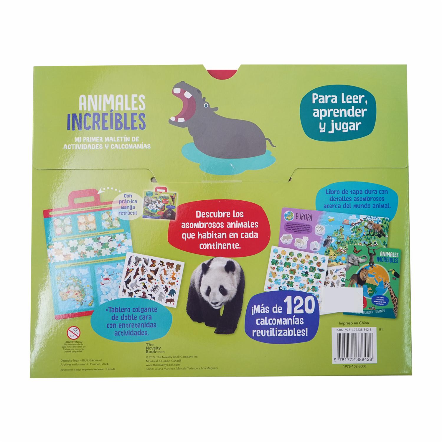 Maletín de actividades con mas de 120 calcomanías reutilizables. Contiene un libro de tapa dura con asombrosas imágenes y actividades para aprender jugando. Descubre los asombrosos animales que habitan em cada continente