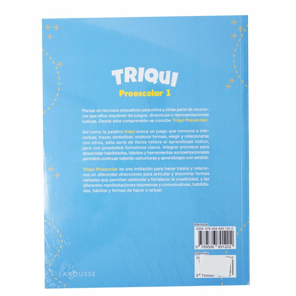 Triqui es un aporte al desarrollo integral de niños y niñas en su educación inicial. Esta serie, conformada por tres libros, parte de una propuesta pedagógica desde la lúdica hacia nuevos aprendizajes construidos desde el desarrollo de habilidades. Así como el juego triqui, esta serie convoca a interactuar, trazar, simbolizar, explorar formas, elegir y relacionarse con otros; alude al aprendizaje lúdico, pero con propósitos formativos claros