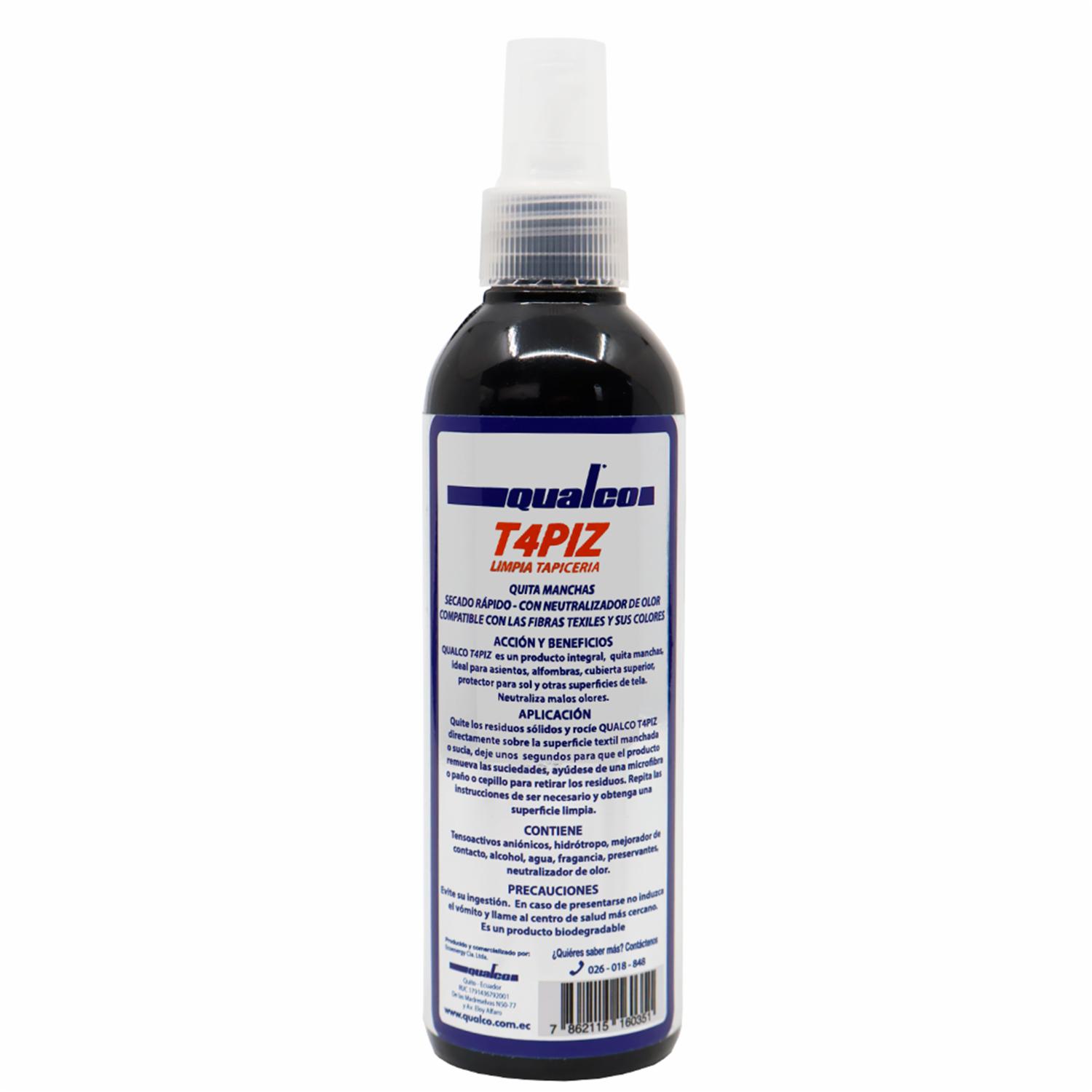 QUALCO T4PIZ: Limpia tapicería. Producto integral que quita manchas y secado rápido. Diseñado para remover las manchas en la tapicería, asientos, alfombras, cubierta superior interna de los autos y demás fibras textiles. Elaborado con materias primas amigables con el medio ambiente y con las manos