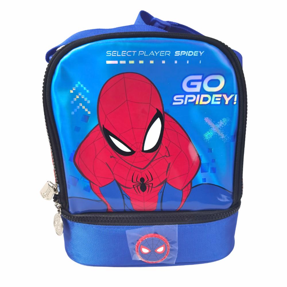 Diseñada para fans de Spiderman, esta lonchera de 2 pisos combina funcionalidad y diseño. Con impresión PU metalizado, forro interno impermeable y espacio para marcar, es ideal para el uso diario. Cómoda de llevar gracias a sus cargaderas en reata. 100% Original PRIMAVERA
