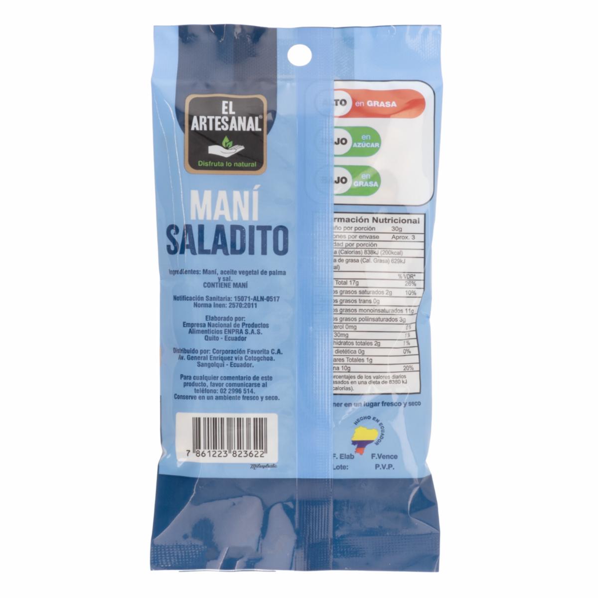 - Tostado al punto justo y con un toque de sal, el maní saladito EL ARTESANAL es ese clásico que nunca falla. Ideal para picar entre comidas o compartir en reuniones. Natural, sabroso y práctico, ¡una delicia simple que siempre se disfruta!