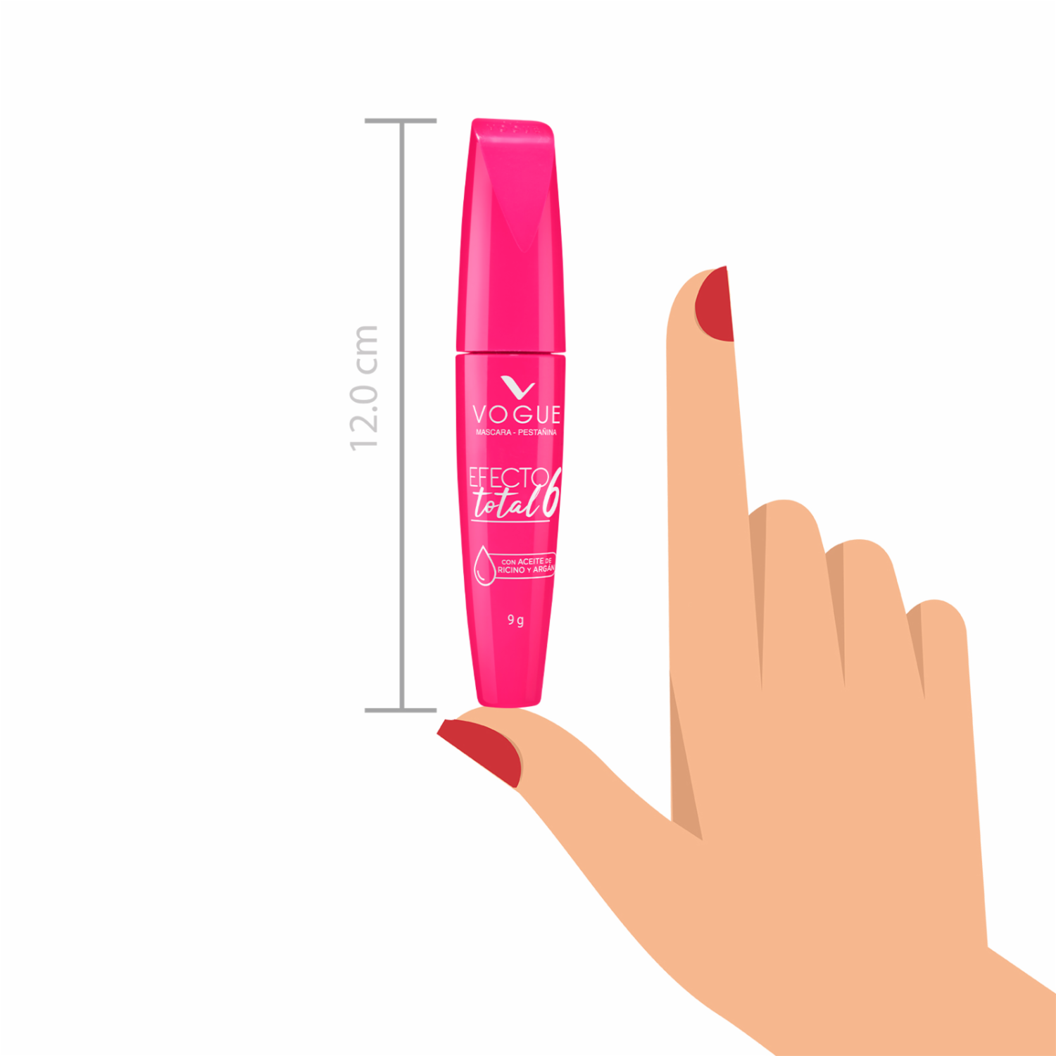 • La máscara de pestañas Efecto Total 6 a prueba de agua de VOGUE, en tono negro y presentación de 9 g, brinda un acabado impactante con volumen, definición y alargamiento