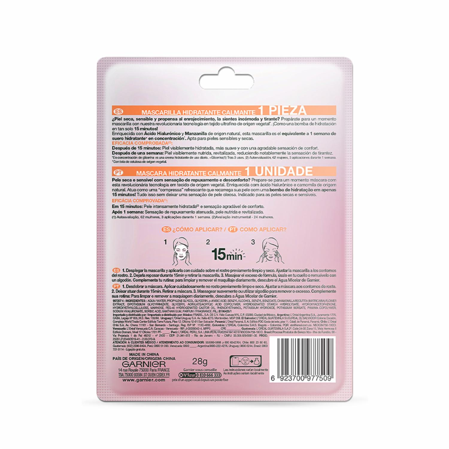 Relaja la piel de tu rostro en tan sólo 15 minutos con la Mascarilla facial en tela calmante hidra bomb de Garnier Skin Active, te brinda una sensación reconfortante al instante. ¡Comprueba su eficacia y fórmula vegana! No contiene parabenos. -Enriquecida con ácido hialurónico y manzanilla. -Ideal para pieles secas y sensibles. -Piel más hidratada y mucho más suave. -Cutis visiblemente revitalizado, nutrido y sin sensación de tirantez. -Aprobada por Cruelty Free International y por dermatólogos