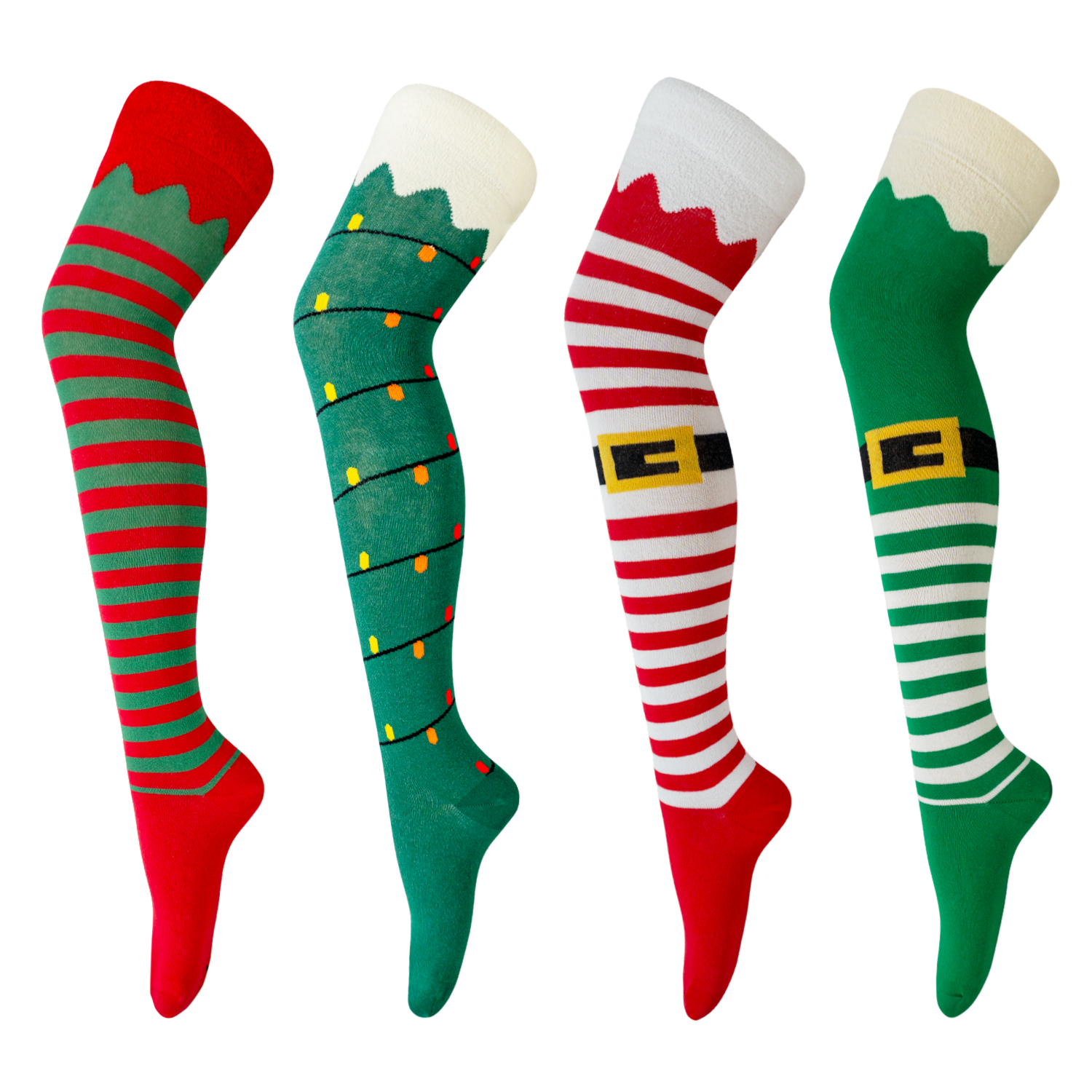 • Estos Calcetines Poseen Las Siguientes Características: Tejido Liso, Corte Sobre La Rodilla, Punteras Remalladas Y Varios Diseños De Navidad
