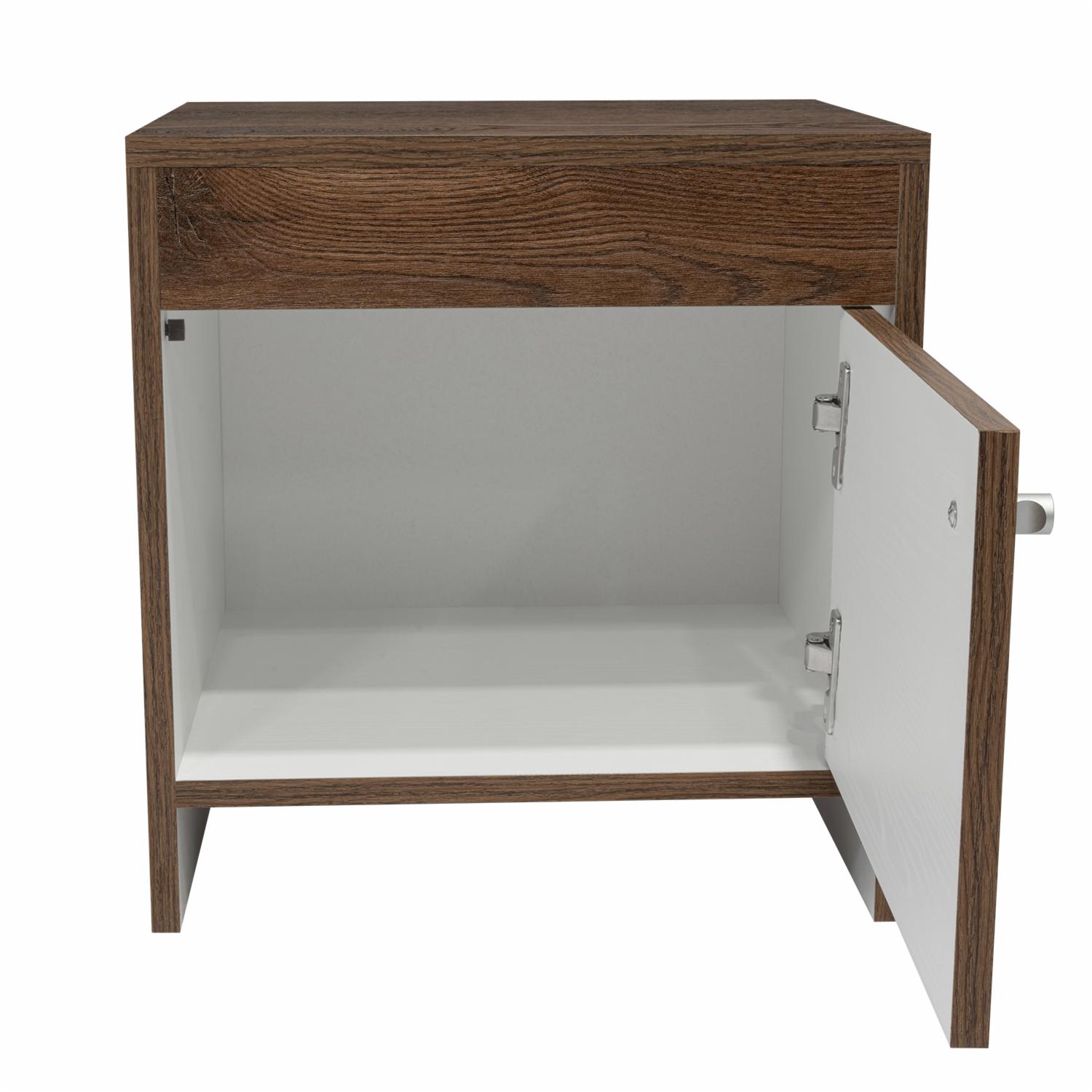 - Mesa de Noche con diseño practico, espacio interior para almacenar objetos, una puerta abatible, manija metálica tipo botón, de fácil instalación