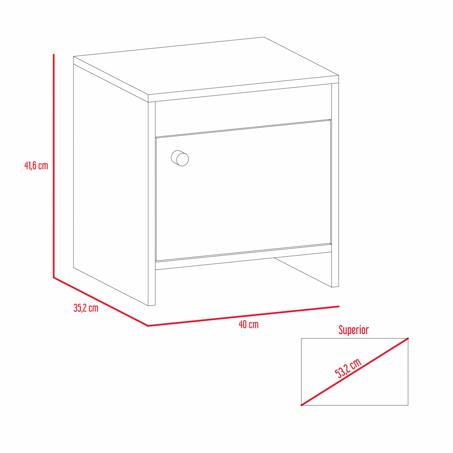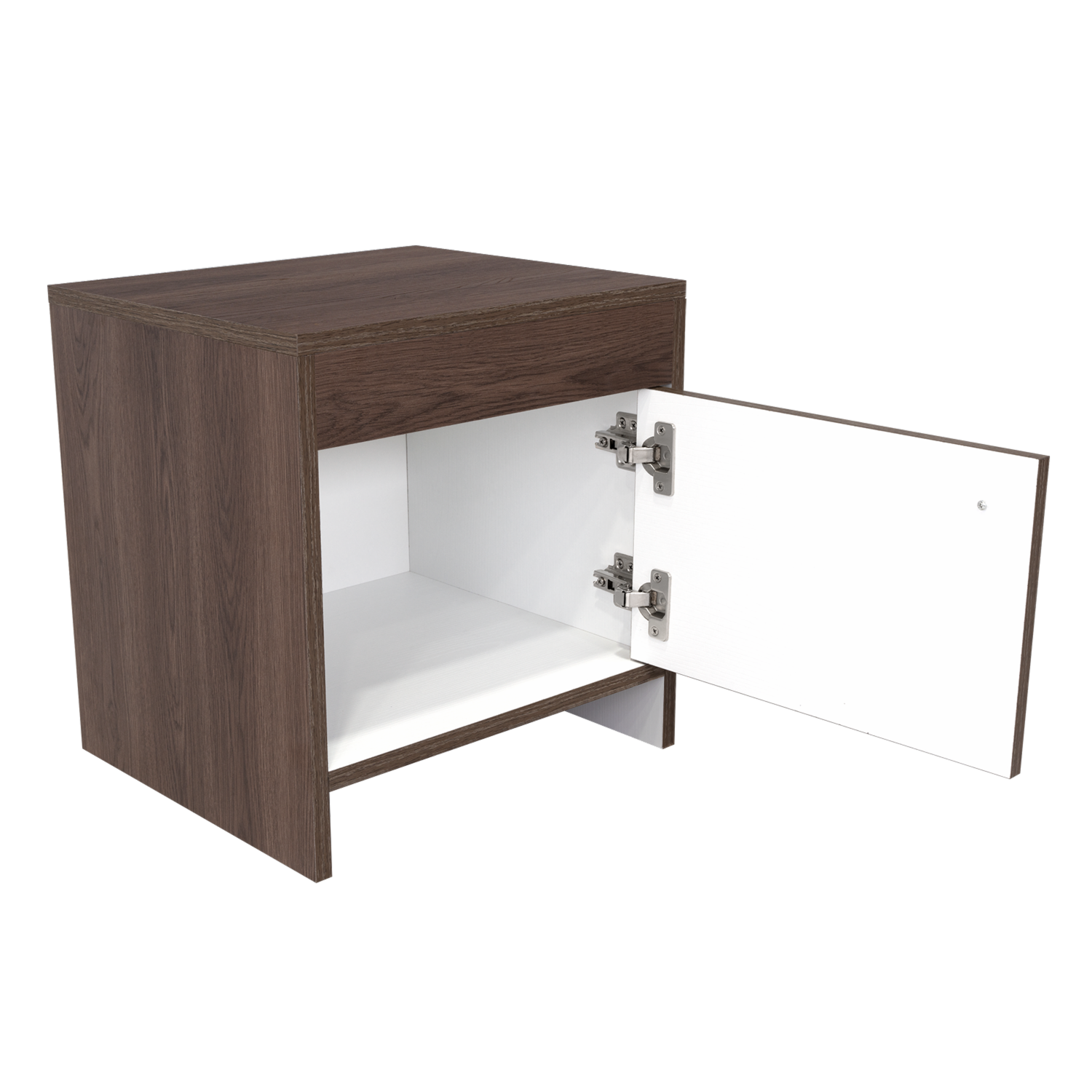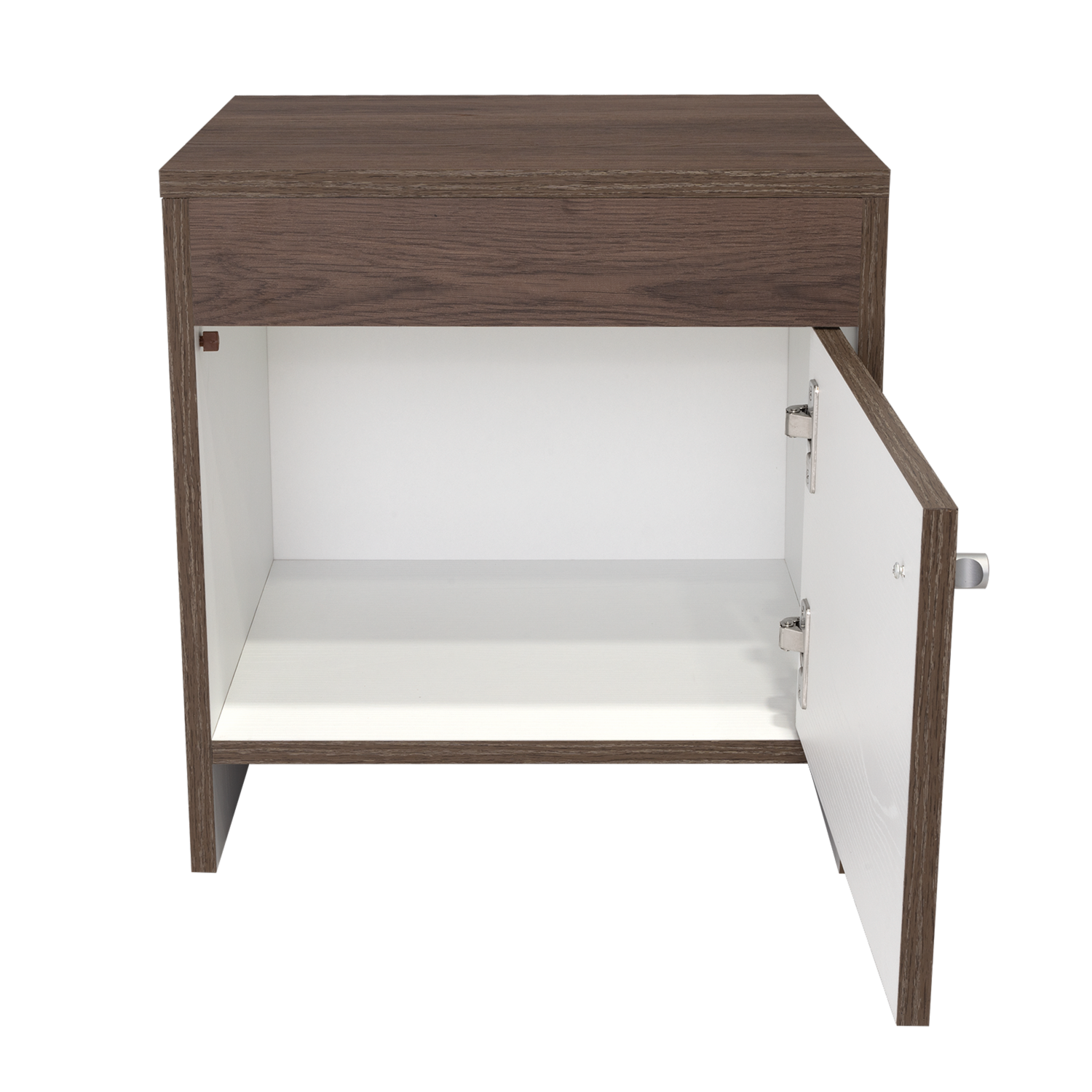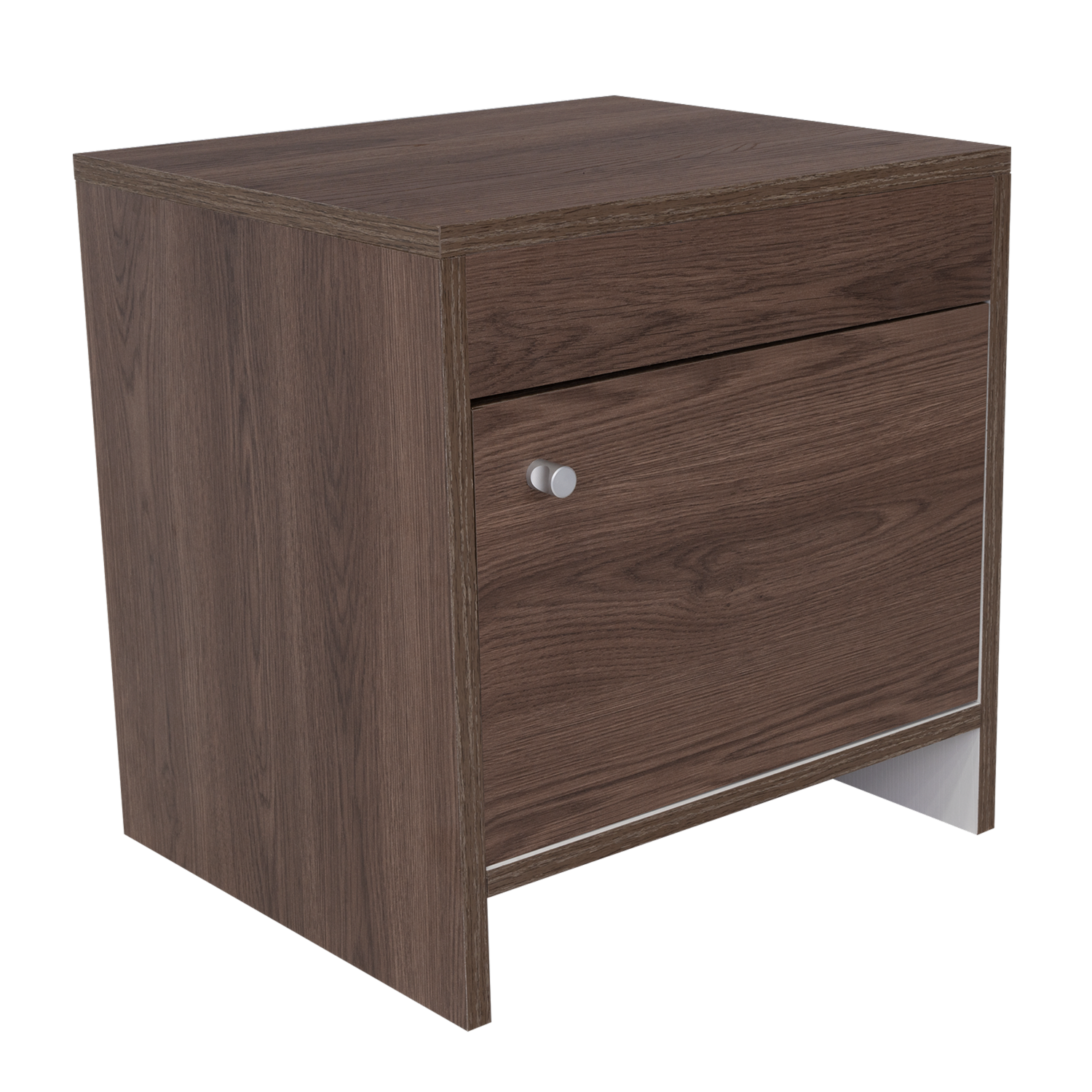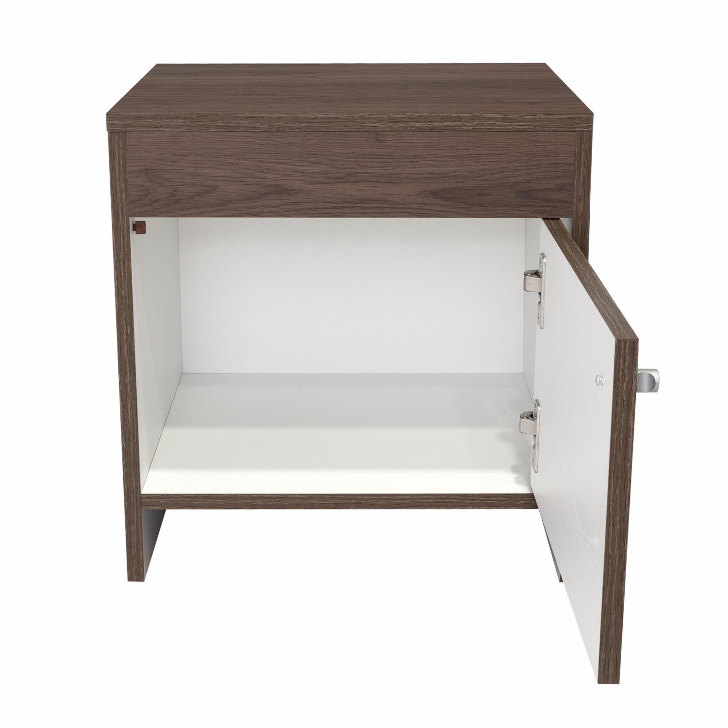 Mesa de Noche con diseño practico, espacio interior para almacenar objetos, una puerta abatible, manija metálica tipo botón, de fácil instalación