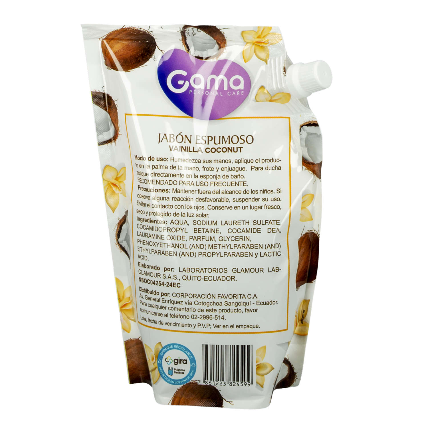 - Disfruta de una limpieza suave y cremosa con el repuesto para jabón espumoso GAMA con fragancia Vainilla Coconut. Su fórmula delicada limpia la piel dejando una sensación hidratante y un aroma dulce y tropical que envuelve tus sentidos. Presentación práctica de 500 ml para un uso prolongado y confortable